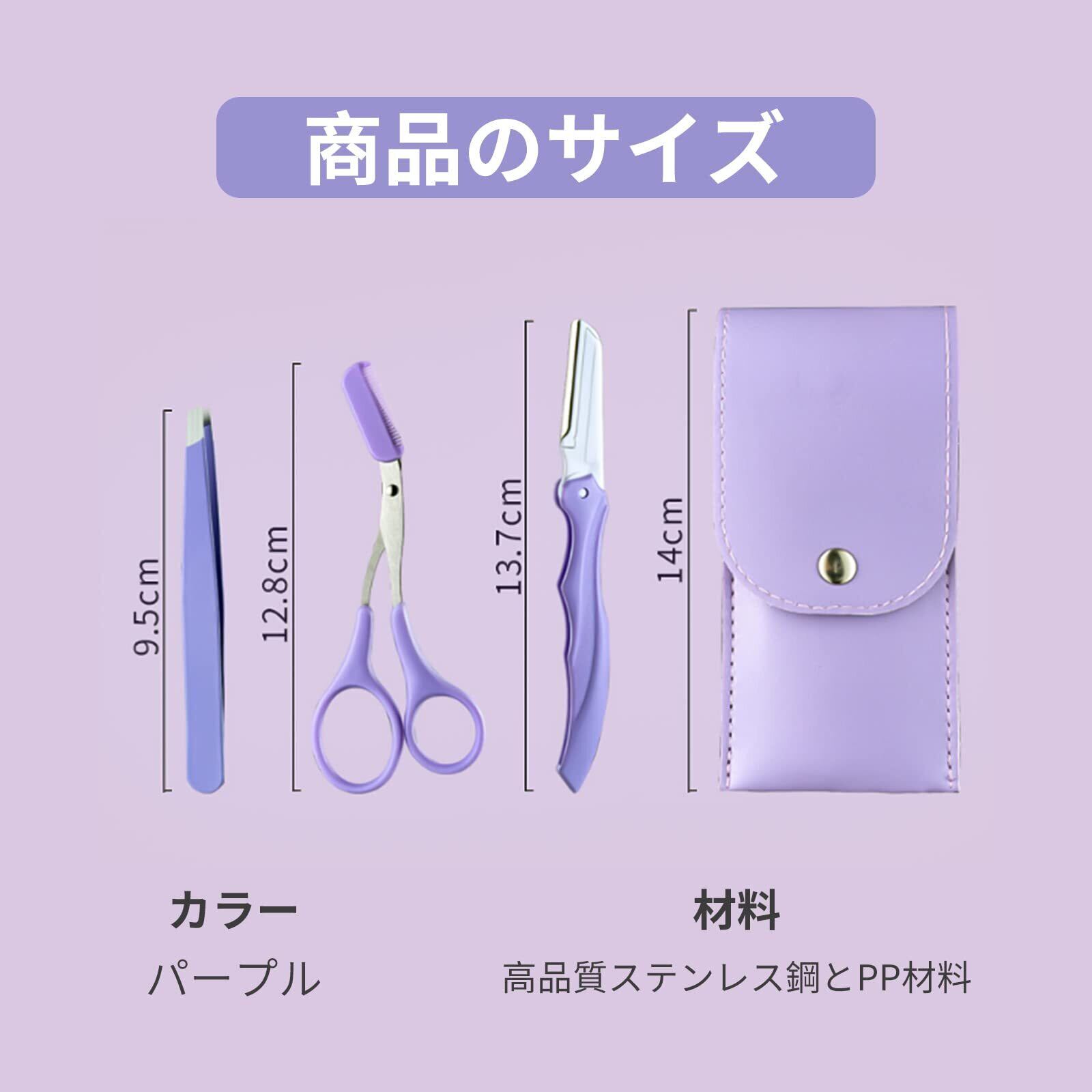 【眉毛セット】眉毛セットは眉毛剃り、毛抜き、眉毛 はさみ (3種類)、収納袋付き。眉毛剃りは毛を剃ることができます。毛抜きは毛を確実に捉えて、軽く抜き取る。眉毛 はさみは毛の流れを整えながら不要な毛をカットできます。ご自宅で眉毛をきれいにカットでき、これが便利。眉毛をキレイに整えると、お顔の印象が全くかわります。