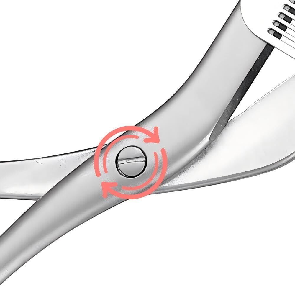 【2 in 1眉カット】このハサミは顔の毛を同時に梳き、剪定することができます。片手で操作することで、カットの長さをコントロールするのに便利です。