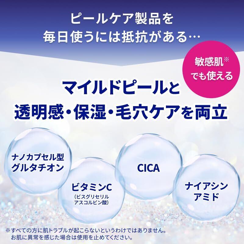 ナノカプセル化された美肌成分※1がぐんぐん浸透※2 壊れやすい美肌成分を保護し、角質層までそのまま届けるために、話題の【ナノカプセル化技術】を採用。トリプルピール成分により角質ケアされた素肌に、美肌成分をしっかりとチャージします。 ✨ナノカプセル化グルタチオン: 肌に潤いを与え、きめ細かく透明感のある印象に導きます。 ✨ナイアシンアミド: 肌のバリア機能をサポートし、自然な明るさを引き出します。 ✨ビタミンC(ビスグリセリルアスコルビン酸): 肌に輝きを与え、明るい印象を引き出します。 ※1ナノカプセル化成分:グルタチオン ※2角質層まで