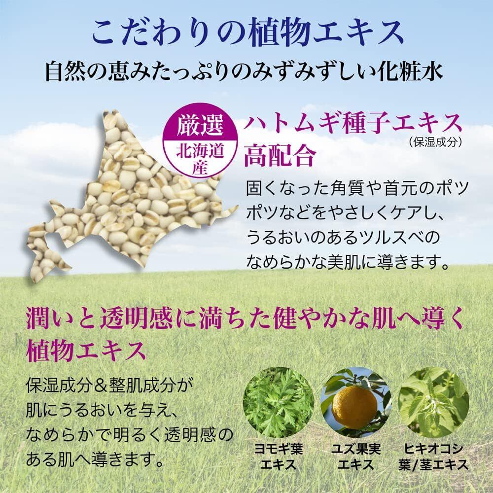 厳選された北海道産ハトムギ種子エキス(保湿成分)を高配合のスキンコンディショナーです。肌荒れを防いで、しっかりお肌を乾燥から守ります。ハトムギ種子エキスの含有量はほかの化粧水より2倍ほど高いめた、保湿効果も倍増します。