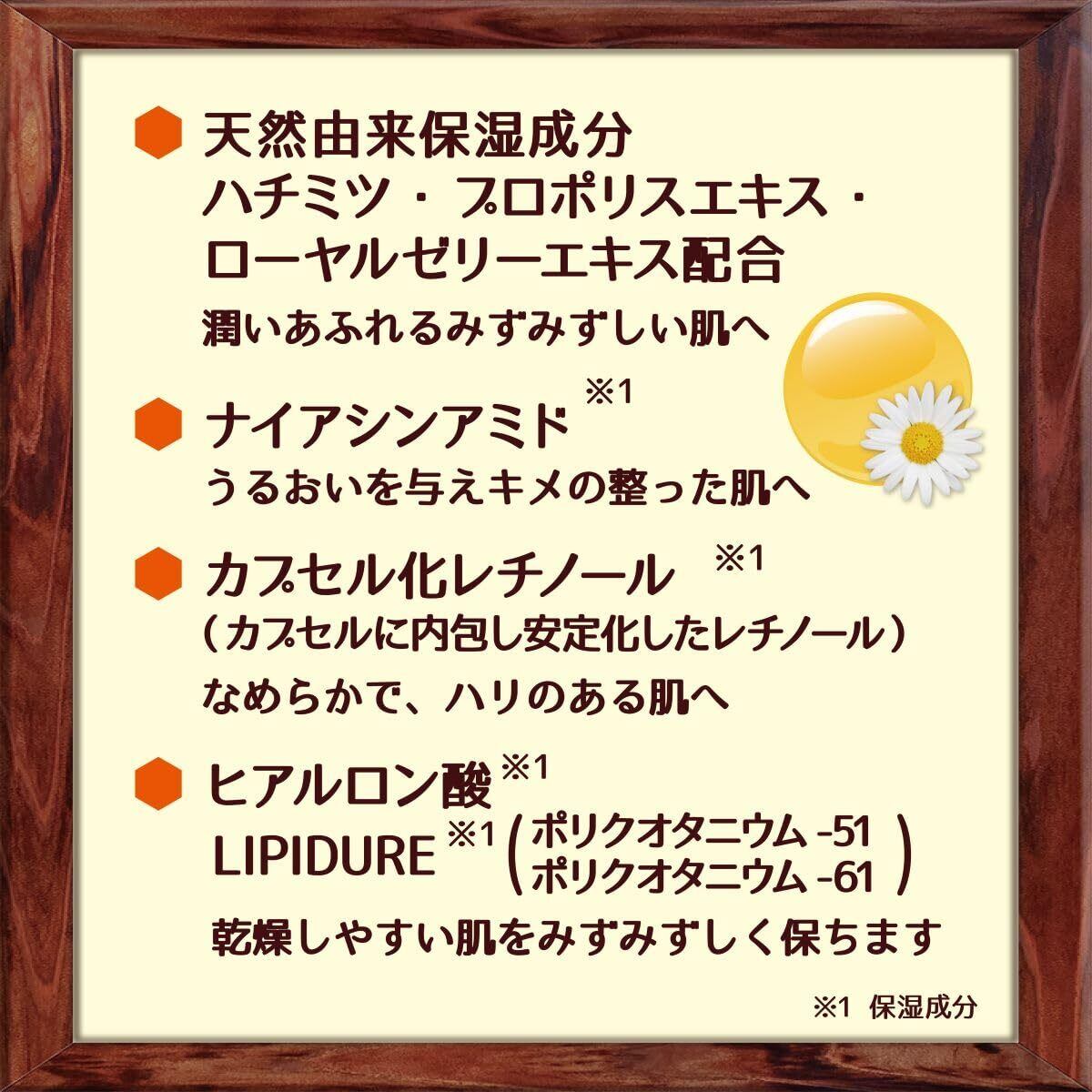 天然由来保湿成分ハチミツ、プロポリスエキス、ローヤルゼリーエキス配合:潤いあふれるみずみずしい肌へ。