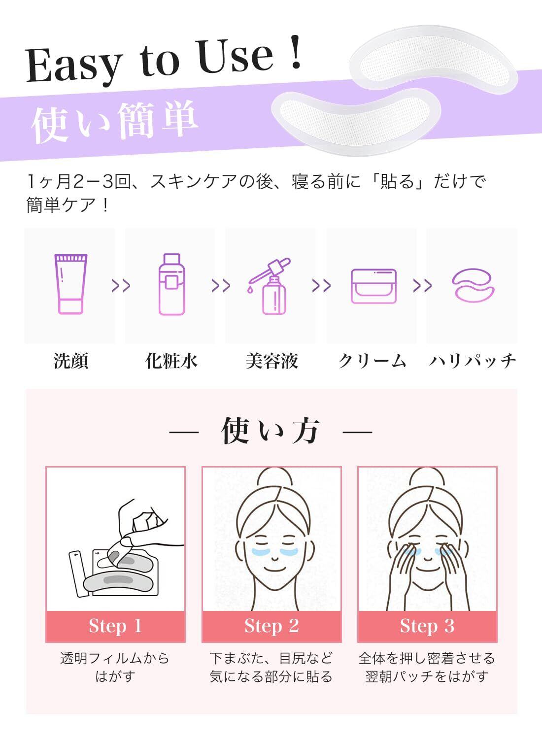【使用上のご注意】 ①お肌に異常が生じていないかよく注意して使用してください。化粧品がお肌に合わないとき、ご使用を中止してください。② 保管及び取り扱い上の注意(1)乳幼児の手の届かないところに保管してください。(2)極端に高温又は低温の場所、直射日光のあたる場所には保管しないでください。③一度ご使用になったパッチは再度使用する事が出来ませんので、必ず廃棄してください。