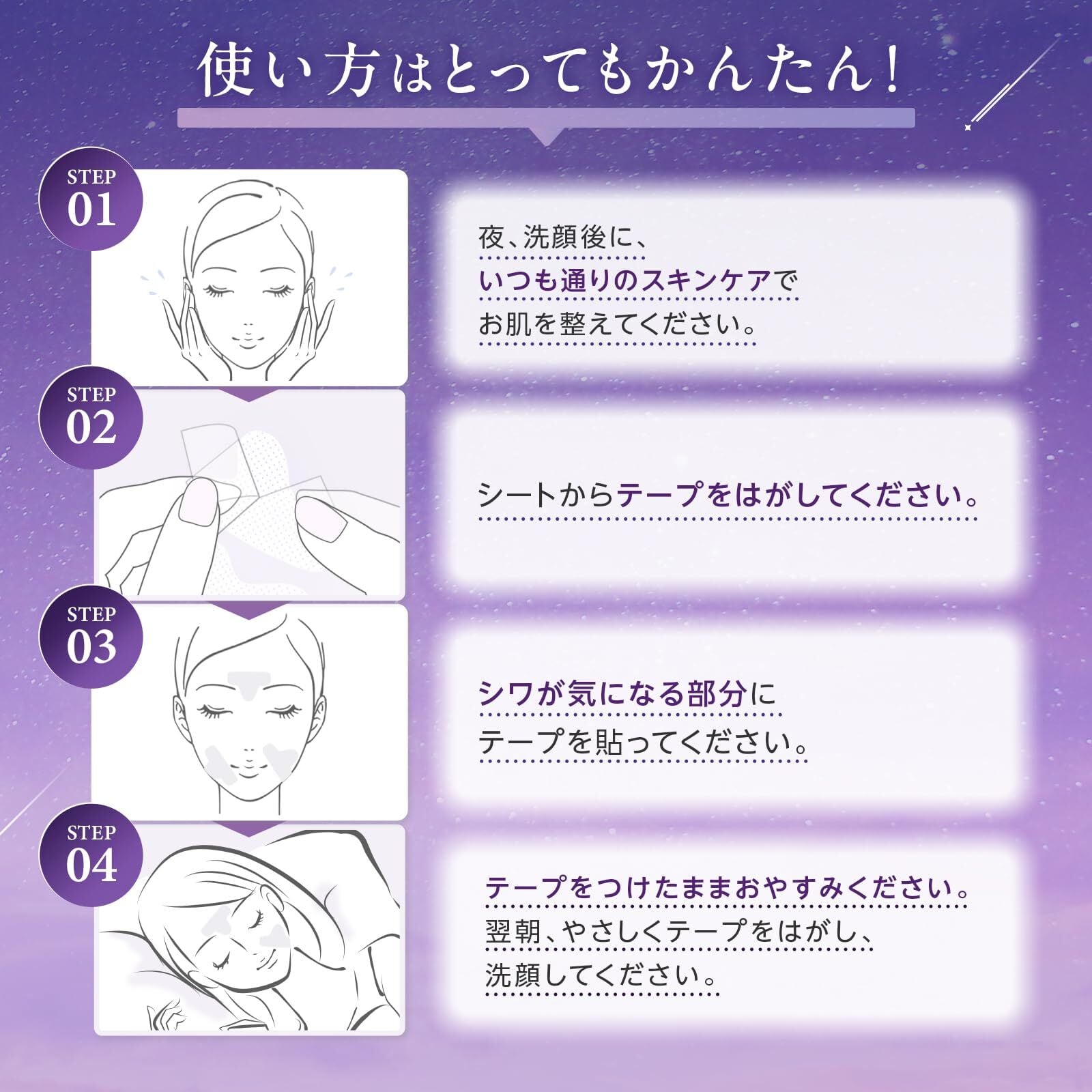 使い方は、とっても簡単!毎晩のスキンケア後、気になる部分にパッチを貼るだけ。