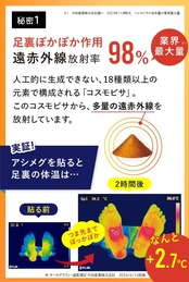 商品特長 むくみ、冷え症対策にぴったり, 足裏に貼るだけで2.7℃温まる, 足裏シート, 遠赤外線放射率98%のコスモビサ業界最大量配合