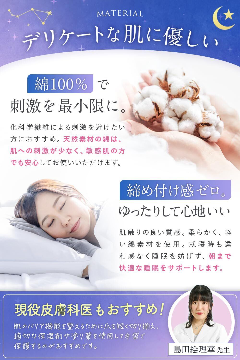 【敏感肌にも優しい天然素材の綿100%】おやすみ手袋の本体部分は、厳選されたコットン100%素材。天然素材ならではの優しい肌触りで、敏感肌の方にも安心してお使いいただけます。柔らかな肌触りで心地よく軽いつけ心地。寝ている間の汗もしっかり吸収。綿100%素材の吸湿性で、ムレずにさらさら、快適なつけ心地が続きます。アトピーなどの掻きむしり対策にもおすすめです。