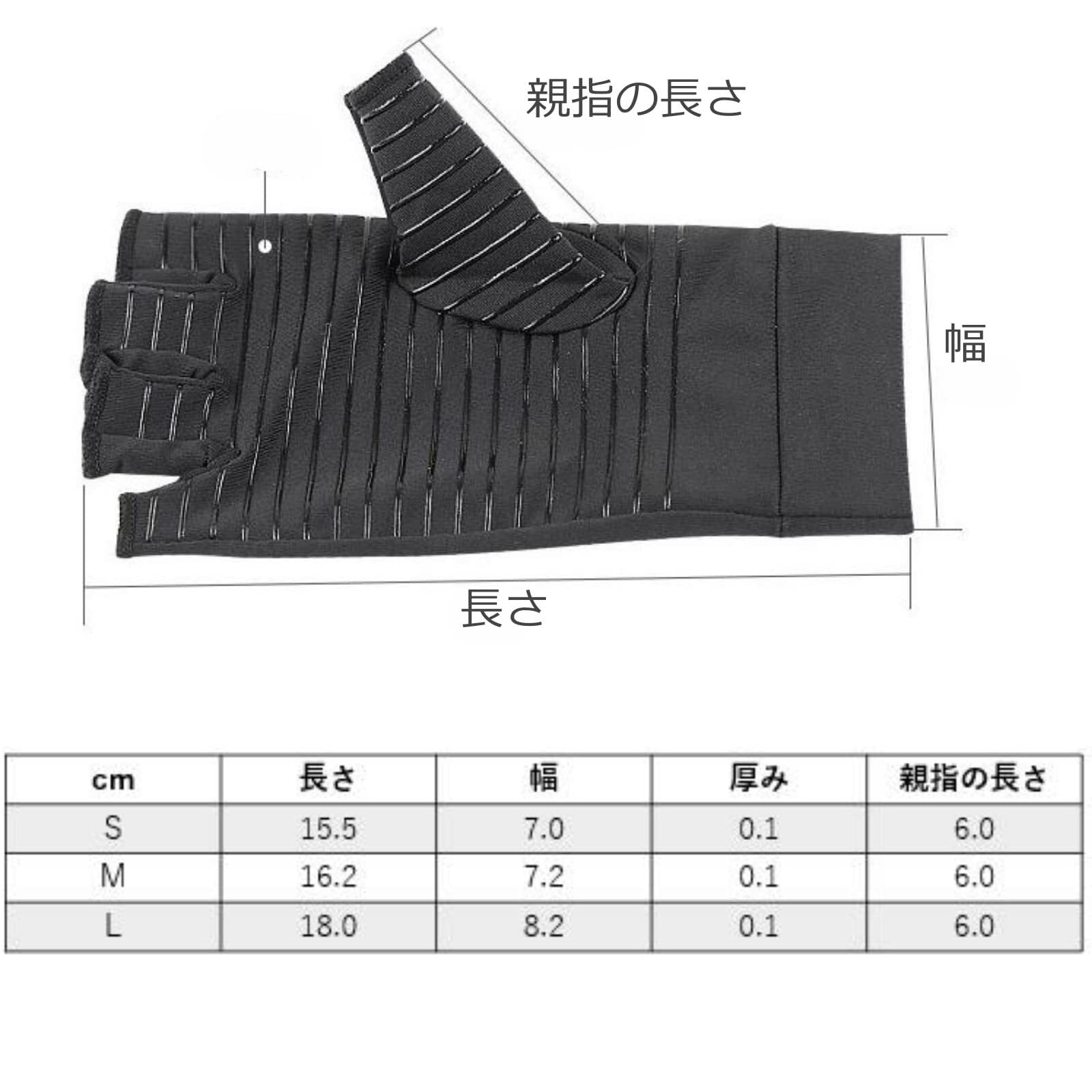サイズ(平置き実寸) S:長さ15.5cm 幅7cm, M:長さ16.2cm 幅7.2cm, L:長さ18cm 幅8.2cm / 手首幅7cm 素材:銅イオン繊維85%、スパンデックス15% + シリコン