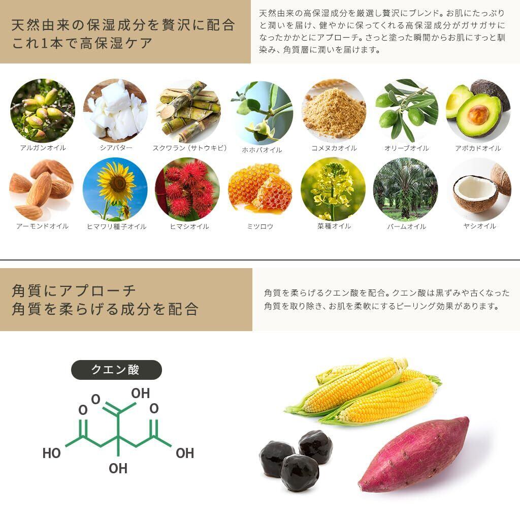 アルガンオイル、シアバター、スクワラン(サトウキビ)、ホホバオイル、コメヌカオイル、オリーブオイル、アボガドオイル、アーモンドオイル、ヒマワリ種子オイル、ヒマシオイル、ミツロウ、菜種オイル、バームオイル、ヤシオイルの厳選した14種類の天然保湿成分を配合し、ガサガサかかとに塗るだけで潤いのあるもちもちの健康かかとへ。乾燥が気になるひじやひざ、指先にも使えます。