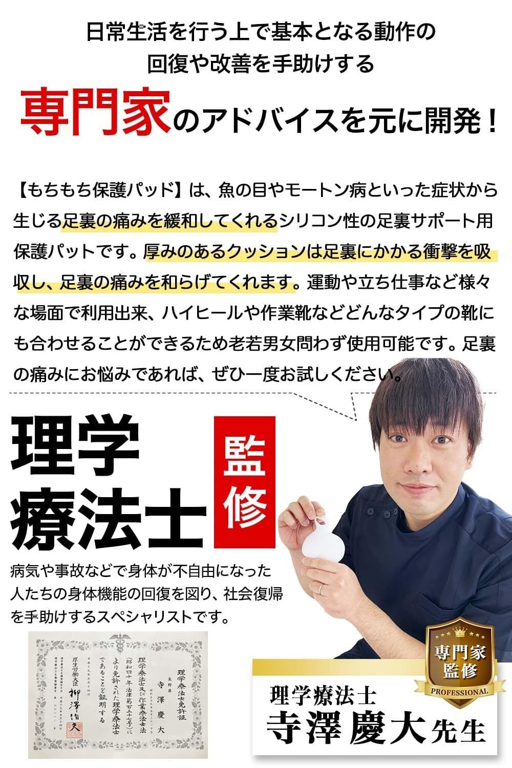 【特徴】足裏もちもち君の特徴は、なんといっても厚みのあるもっちりクッション!とっても気持ちいい厚みで衝撃吸収!痛みをサポートします。パッドの素材は、表面はシリコーン、中はシリカゲルから作られており、びよーんと伸びるもっちりの正体です。モートン病を起こしやすいと言われる、ハイヒールを長時間履く方の靴ずれ防止・負担軽減にもオススメ。足裏のバランスを良くすることで、膝・腰への負担をサポートします。