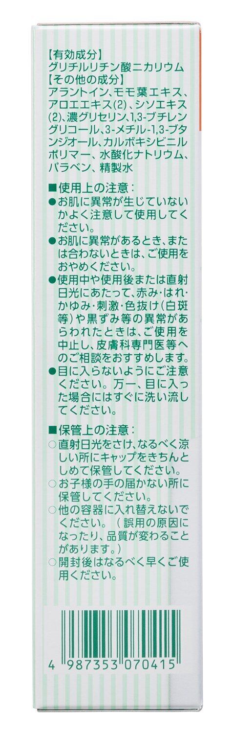 全成分 : グリチルレチン酸二カリウム、アラントイン、モモ葉エキス、アロエエキス、シソエキス、濃グリセリン、1,3-ブチレングリコール、3-メチル-1,3-ブタンジオール、カルボキシビニルポリマー、水酸化ナトリウム、パラベン、精製水