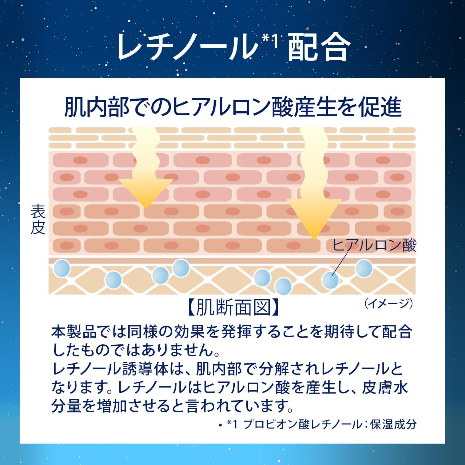 ●ナイトケアに使用される成分レチノール(プロピオン酸レチノール)と、消費者の使用意向の高いヒアルロン酸を4種類配合。