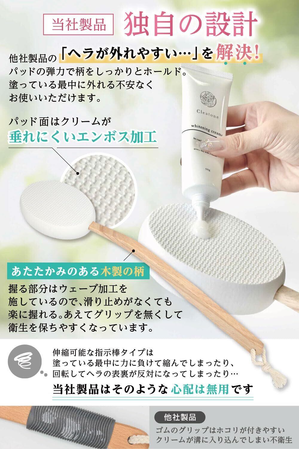 Cleatoneの背中にクリームを塗る道具は、医師監修のもと、摩擦の少ないパッドを採用し、手にフィットする木製ハンドルと衛生的なグリップ設計を実現しています。 他社製品のヘラが外れやすい、グリップが不衛生、伸縮して使いにくいといった問題を解決しています。