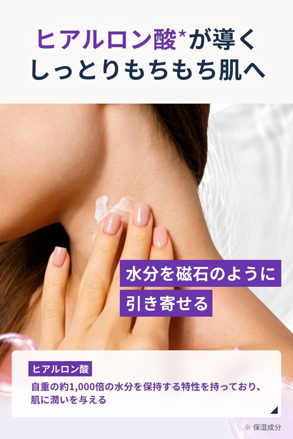 【ヒアルロン酸が生み出す、しっとりもちもち肌】 ヒアルロン酸は自重の約1,000倍の水分を保持する特性を持っており、水分を磁石のように引き寄せ、乾燥によるカサつきを防ぎ、うるおいのある肌へ導きます。