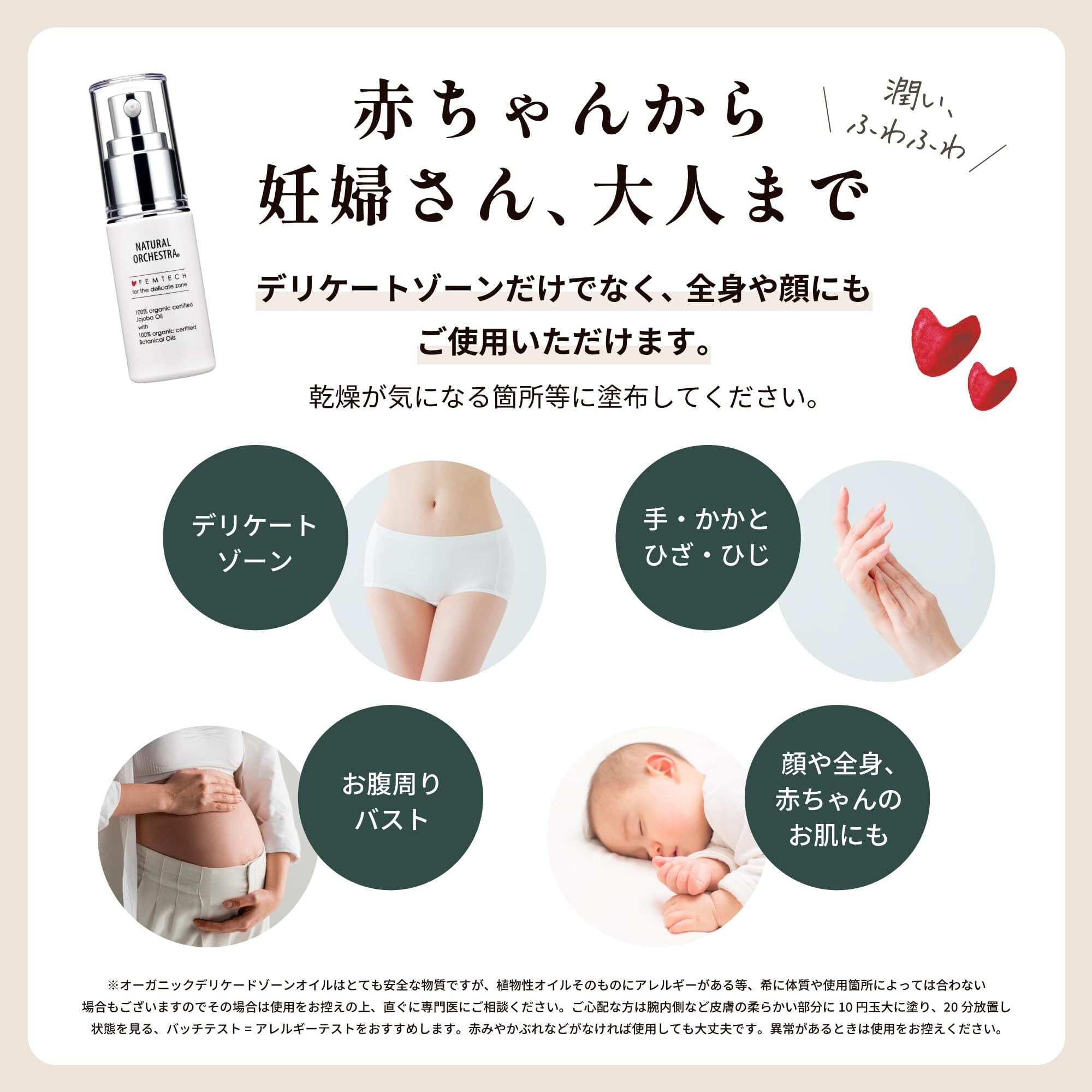 【 赤ちゃんから妊婦さん、大人まで】 厳選した天然植物由来成分のみで出来ているので、どなたでもお使いいただけます。デリケートゾーンはもちろん、顔・手・かかと・ひじ・ひざ・バスト・お腹周りなど全身の保湿ケアにお使いいただけます。無添加で肌に優しいオイルで、敏感肌にも安心してお使いいただけます。