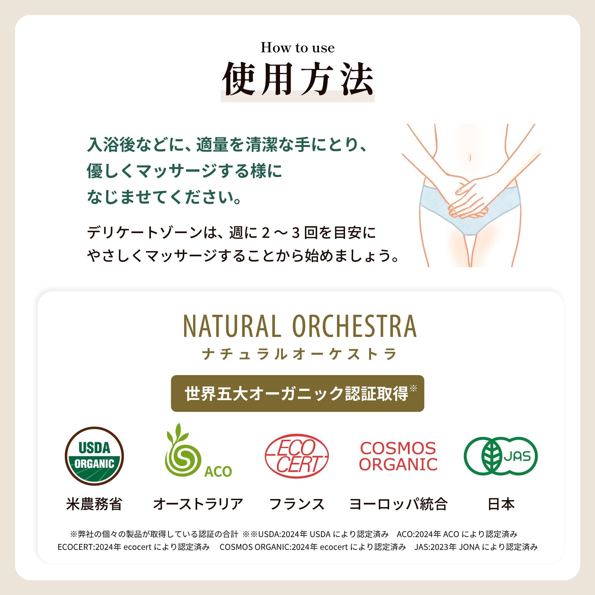 【 ナチュラルオーケストラ オーガニックデリケートゾーンオイル】 デリケートゾーンのケアに適した、4種類の天然オーガニックオイルをブレンド。女性のデリケートな部分を優しく保護しながら、肌コンディションを整えます。