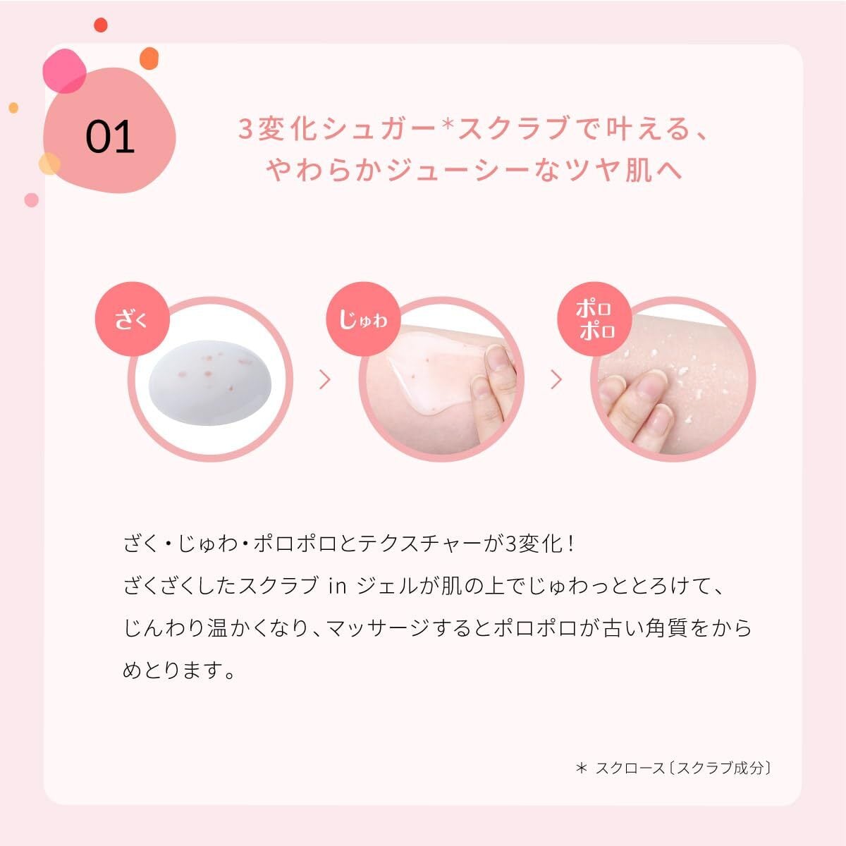 【やわらかジューシーなツヤ肌へ】肌あたりのやさしいジェルでマッサージするだけで、おだやかに全身ポロポロ角質ケアできる新感覚のボディ用シュガー*スクラブです。洗い流した後は果実のようにみずみずしい、思わず触りたくなるやわらかジューシーなツヤ肌へと導きます。(*スクロース〔スクラブ成分〕)
