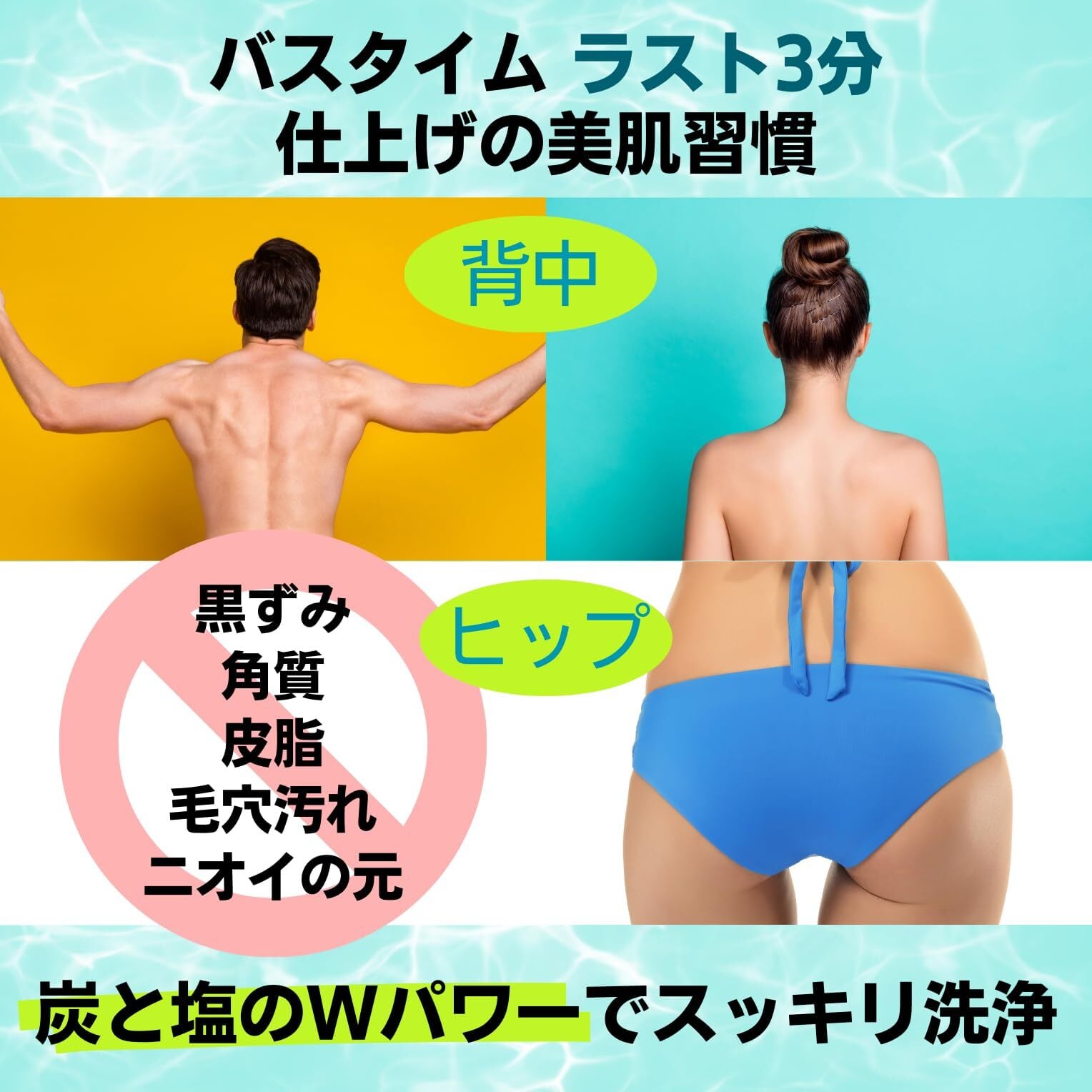 新習慣:炭と塩のWパワーで仕上げのマッサージ洗浄。これ1つで:「ニオイの元を洗浄」&「お肌のひきしめと潤い」