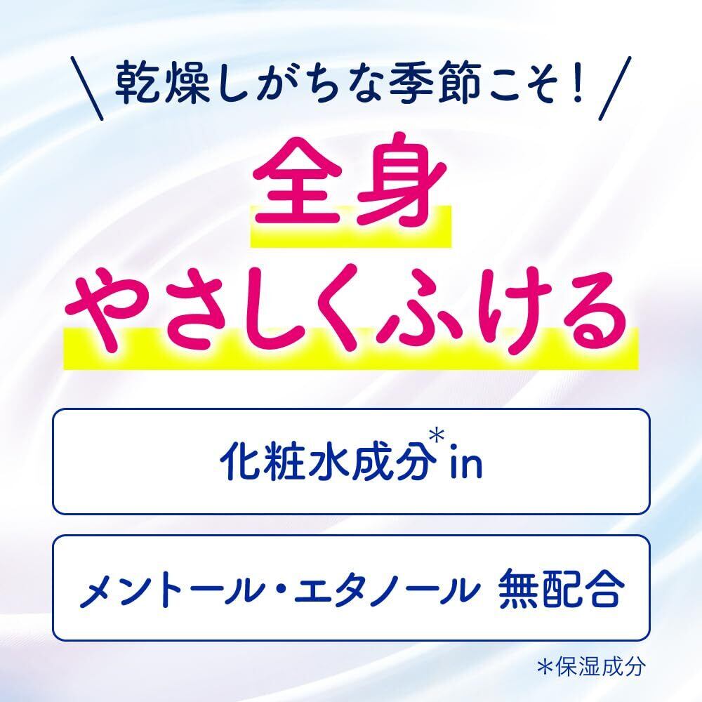 湿度・温度ストレス*から解放!乾燥しがちな肌も、汗のべたつきやさしくふきとる。化粧水成分(保湿)配合の液たっぷりシート。天然コットン使用のやわらかシートで顔までふける。大判シートで全身の汗・ベタつきすっきり。メントール・エタノール・パウダー無配合。すがすがしいせっけんの香り。*汗・ベタつきの不快感