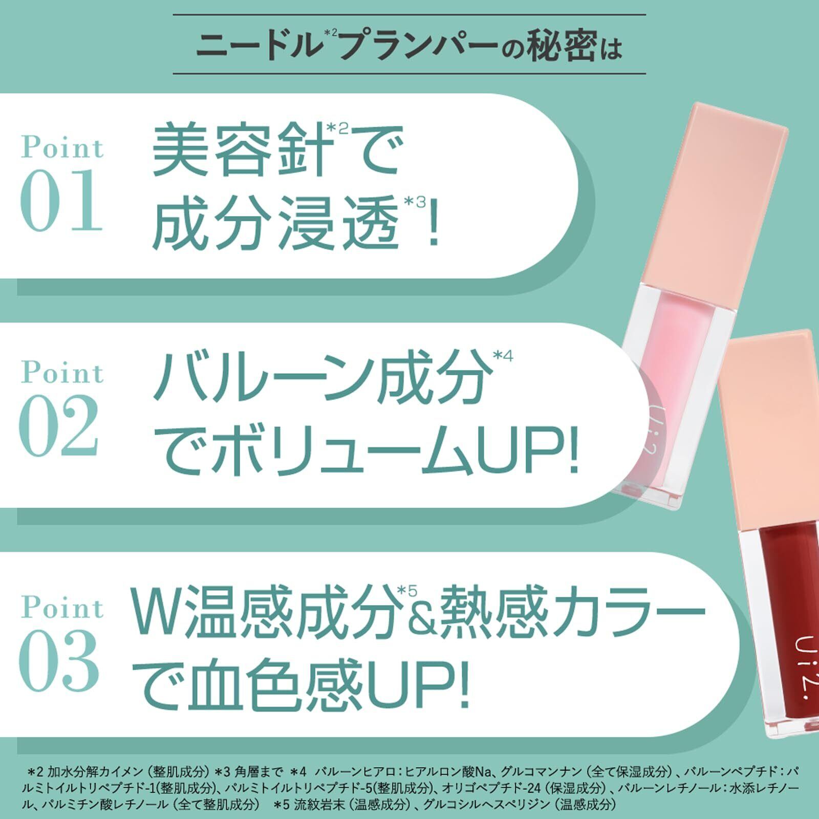 【Ui2. ニードルプランパー】ひと塗り6000本の針*1で唇を刺激!ボリューム&血色感upで中顔面短縮を叶える*2、美容医療発想のニードル*1リッププランパーです!唇周りのナイトケアまでできる透け感ピンクカラー。(*1加水分解カイメン(整肌成分)、*2メイクの視覚効果による)