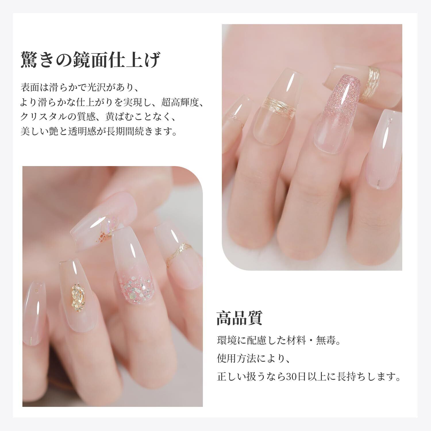 【超長持ち】超耐久性で、30日以上に輝くツヤと透明度が持続出来ます。クリスタル級のツヤ感と透明感のあるノンワイプトップジェル。天然樹脂と成分を使用しており、無毒で安心してお使いいただけます。肌にやさしいジェルネイル。