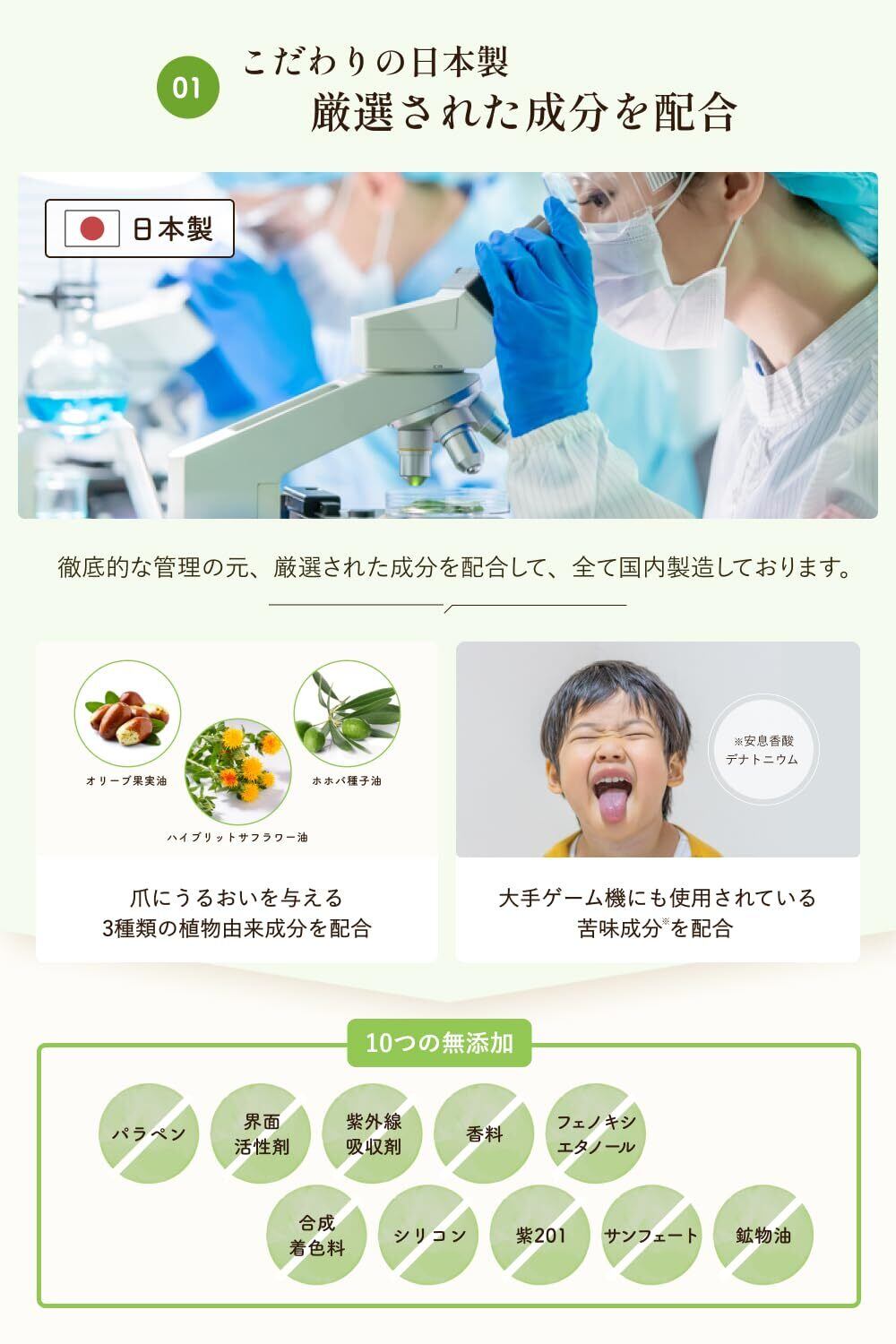 【植物由来成分・苦味成分を配合】「安心できる物を使って癖を卒業してほしい」そんな思いから厳選した植物由来成分を配合しており、苦味成分には子供のおもちゃやゲーム機にも使用されている「安息香酸デナトニウム」という成分を配合しております。 ※成分については第三者機関による分析試験済みのため安心してお使いいただけます。