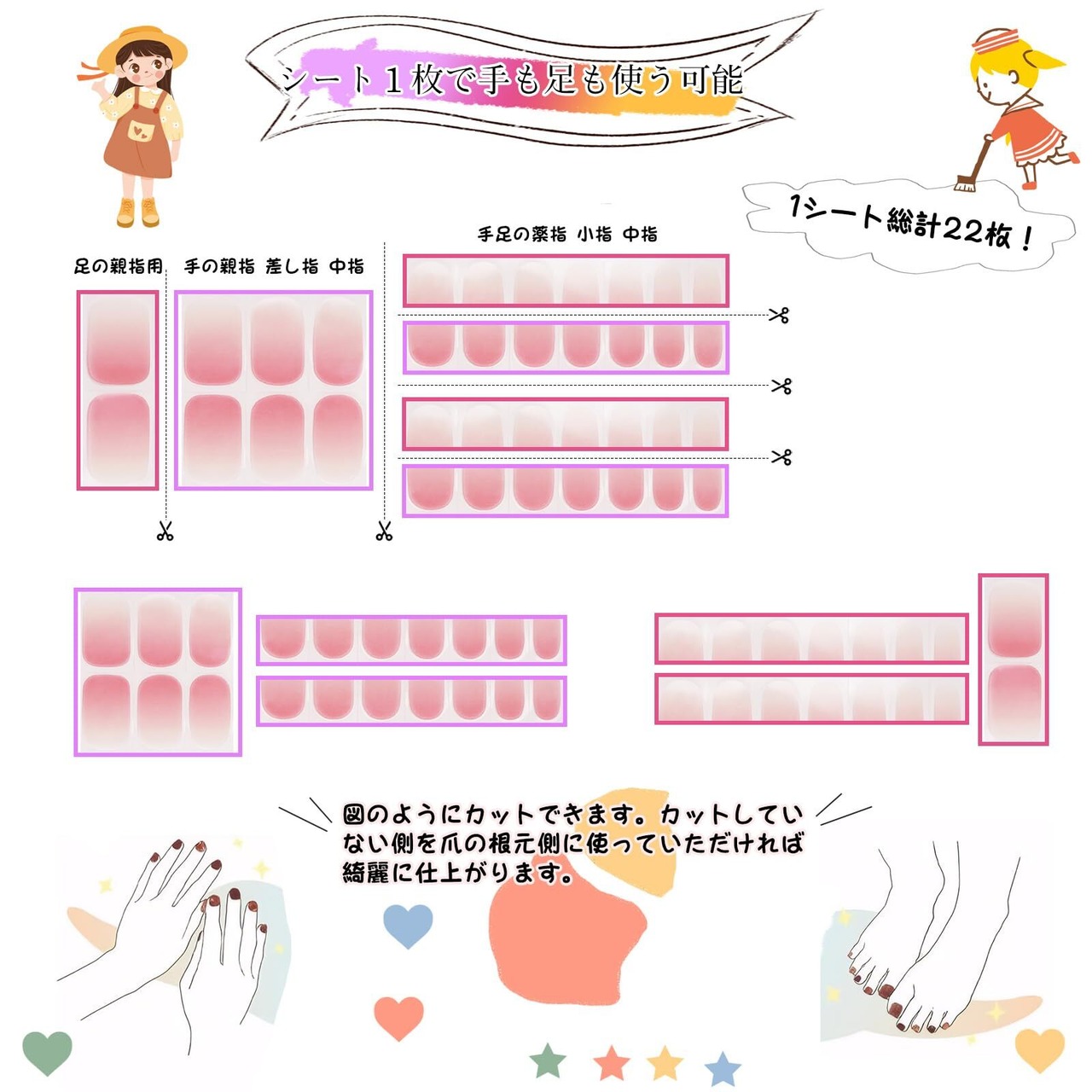 【1シート22枚】1シート22枚の硬化タイプジェルネイルシールです。爪の大きさにかかわらず、自分のサイズに合ったシールを選べます。また、ハンドとフット両方に使うこともできます