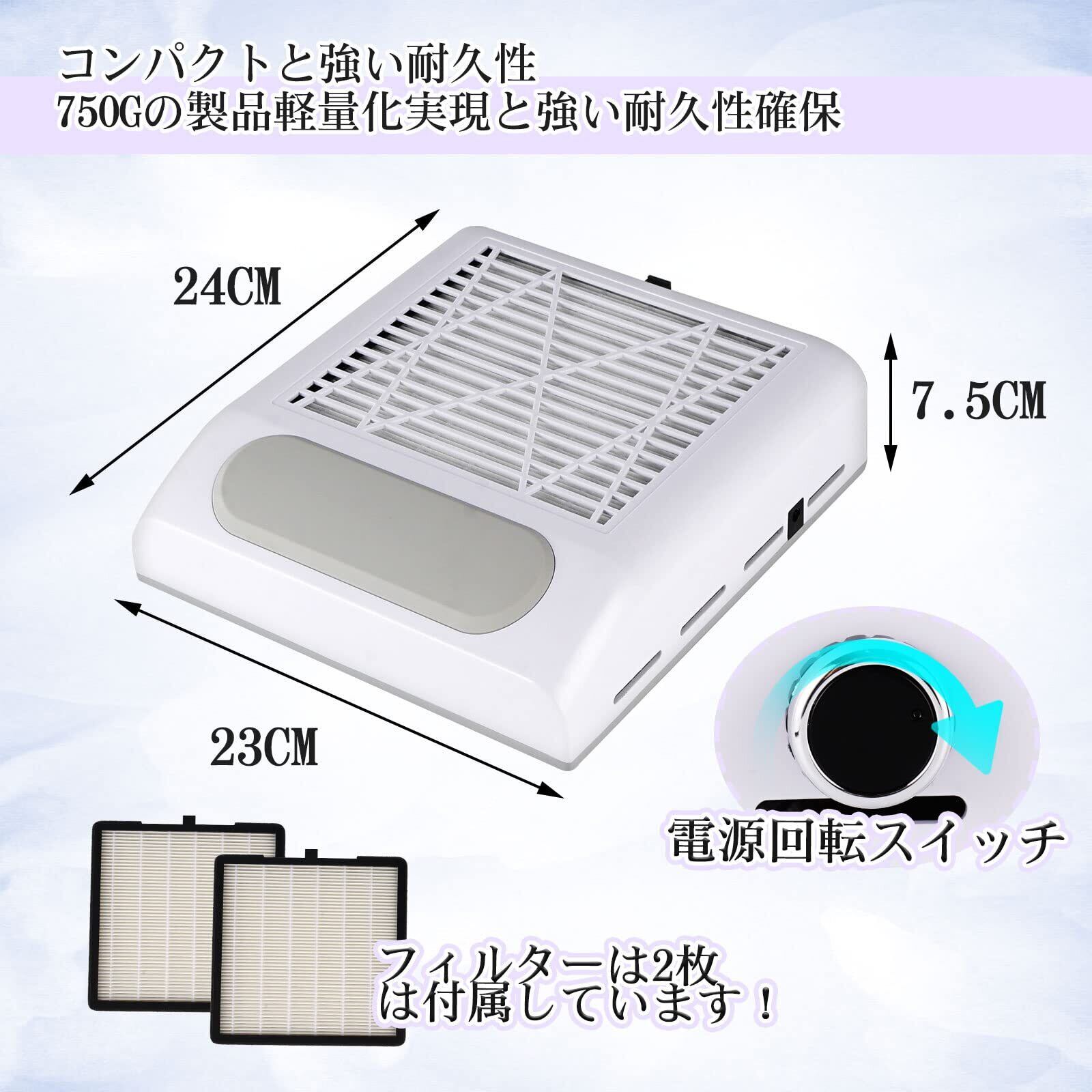 【80Wのハイパワ吸引力ー&広め集塵口】ネイル集塵機が80Wのハイパワー&4500rpmの回転速度で、ダストを徹底的に吸引して舞い散りを防止します。空気中に舞うダストをハイパワーで徹底的に吸引し、処理面積の広いプリーツ構造の特殊引き出しフィルターを採用しており、逆流現象を防ぎ、ダスト漏れの心配もありません。手が置きやすいよう、施術中もストレスを感じにくいで、本体の上に手を載せて使うので、視界を遮らないのもメリット。また、集塵口の面積が広いので、一度にたくさんのダスト吸引ができる。ネイルダストコレクターの 底面にはヒートシンクの穴があり、連続作業でも本体が熱くなりませんので、使用時間が長くても安心。モーターの寿命が約10,000時間!放熱性と耐久性が抜群です。