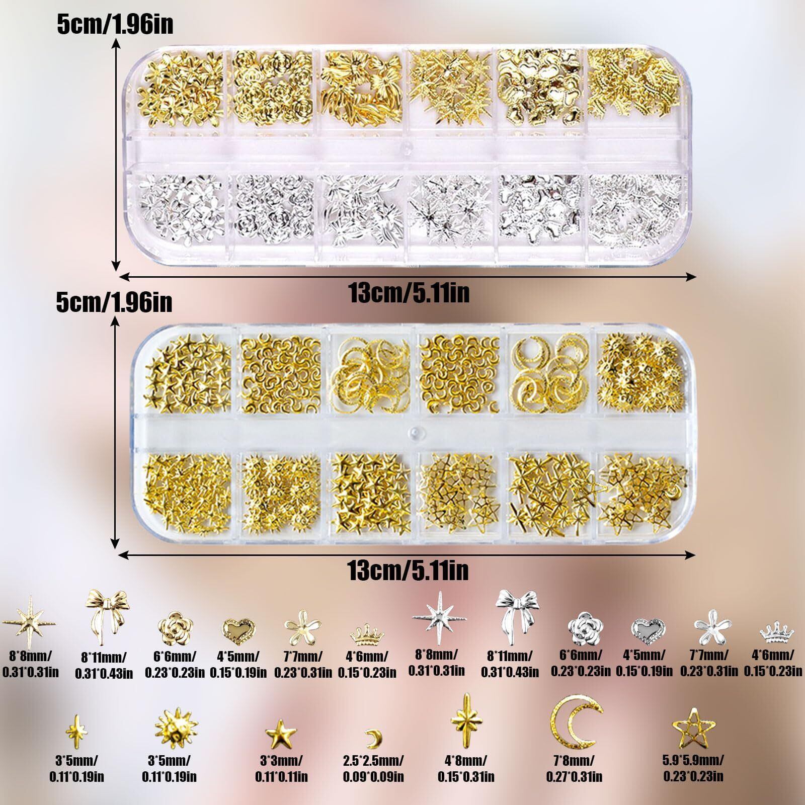 【デザイン】星、月、花、ハート、リボンなど様々な形があり、ゴールドとシルバーの2色があり、絶妙で美しく、ネイルに飾ると美しくてファッショナブルで、エレガントで魅力的なマニキュアを簡単に作成できます。