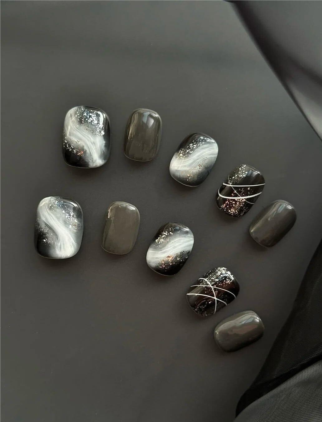 LemiVibe·「天の川の破片」ネイルチップ ショート 短め 黒 100%ハンドメイド 貼るだけネイル つけづめ つけ爪 春 人気 可愛い 韓国 ジェルネイル ネイルシール セルフネイル ネイルステッカー おうちネイル ネイルデザイン セルフネイル ネイルアート