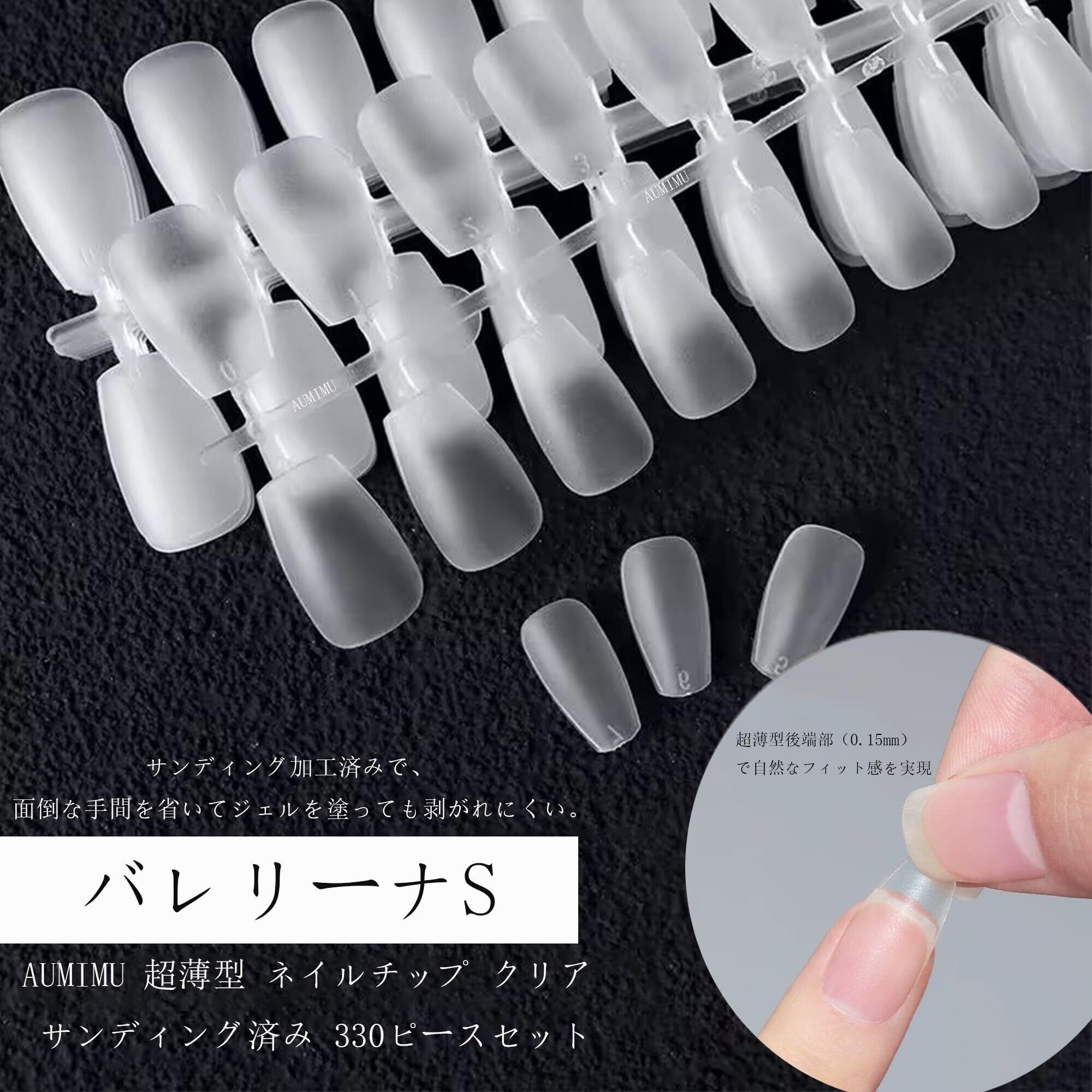 アジア人女性向けに特別に開発,AUMIMU 超薄型 ネイルチップ クリア サンディング済み 330ピースセット。自然な仕上がりを手軽に!【材質】アクリル 【サイズ】7サイズ 【数量】330ピース
