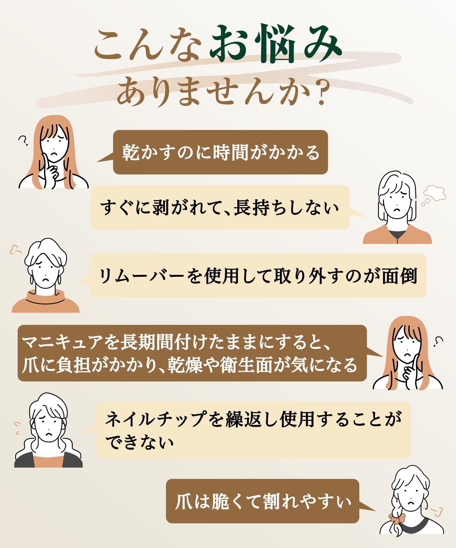 【長時間の強力フィット】 自爪とネイルチップをしっかりと密着させ、剥がれにくく、ずれにくいので、長時間持続します。 水にも強く、手洗いや入浴、洗面台など水回りでも安心してネイルチップを楽しめます。 ※長時間の浸水は避けてください。