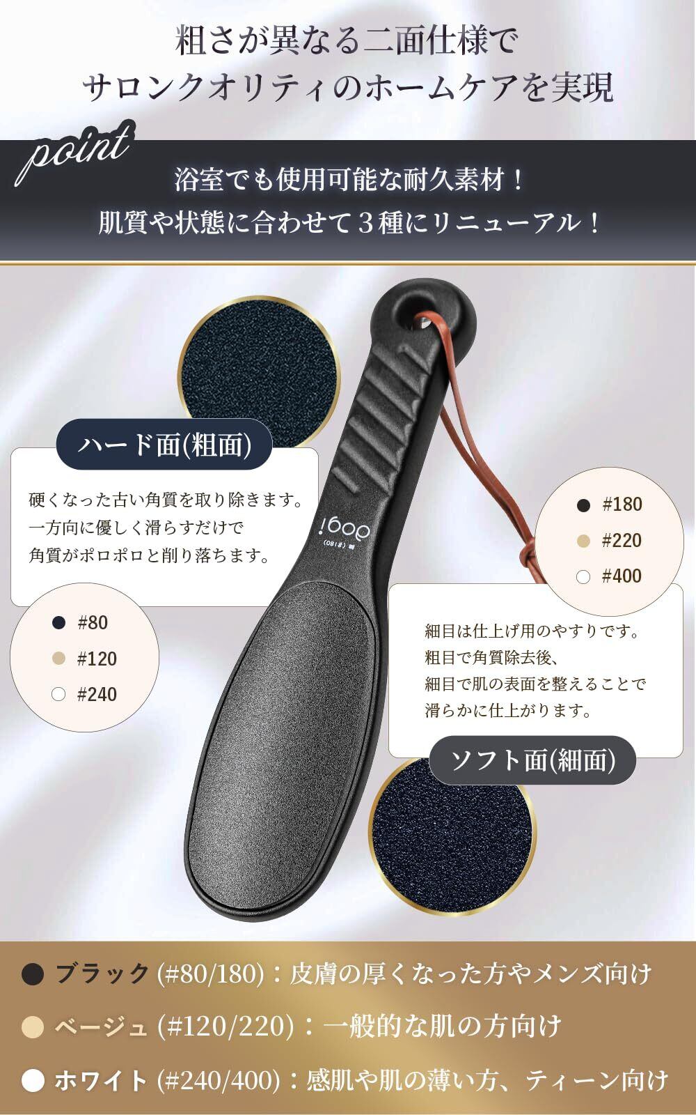 【ダブルグリットで効果的なケア!】180グリットと80グリットの両面を搭載し、軽い角質からしっかり硬くなった角質まで、効果的にケアが可能です。使用者のニーズに合わせた使い分けができ、完全な仕上がりをサポートします。