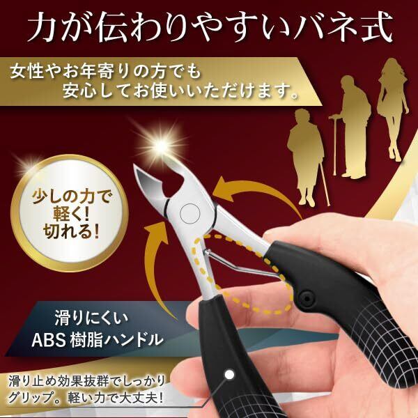 【安心の滑り止め設計】グリップ部分は滑りにくいデザインで、高齢者や手の力が入れにくい方でも安心してお使いいただけます。力を入れずに爪を切ることができるため、初心者の方や介護をされている方にもおすすめです。