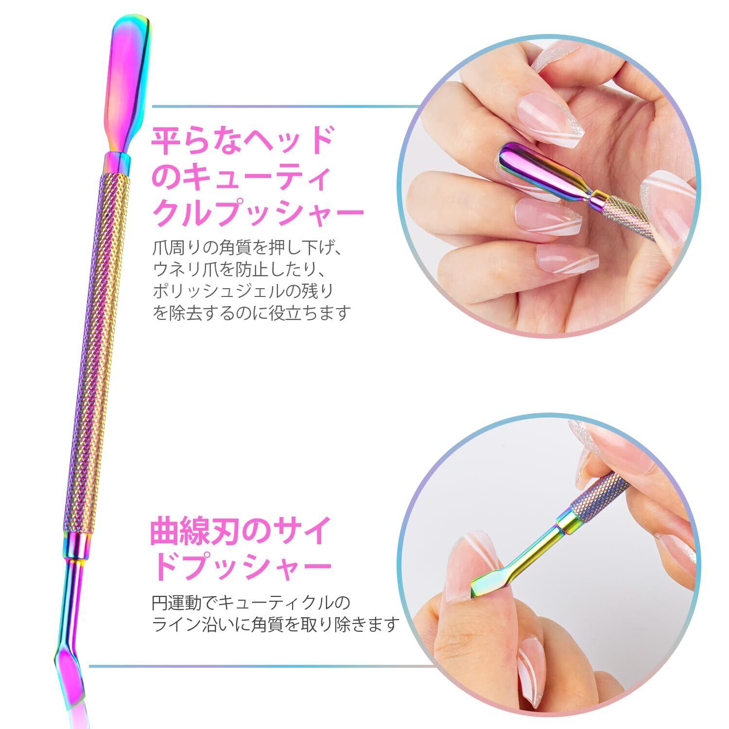 キューティクル・プッシャー&キューティクル・リムーバー-平らなヘッドで爪の周りのキューティクルをやさしく押し下げ、ポリッシュの後に残ったジェルを取り除きます。