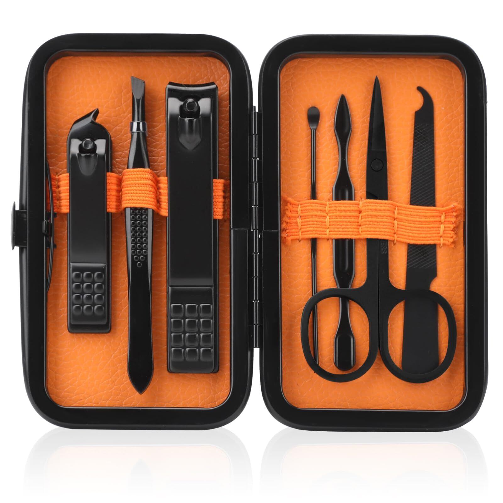 [メンズレディースマニキュアセット] ユニークな黒+オレンジの配色で、この爪切りセットは、男性と女性の両方に適しています。ハンドケア、フェイシャルケア、フットケアツール(大型爪切り、小型斜め爪切り、眉毛はさみ、眉毛ピンセット、耳かき、爪やすり、爪クリーナー、携帯用トラベルPUケース)を含む多機能トラベルマニキュアセット。