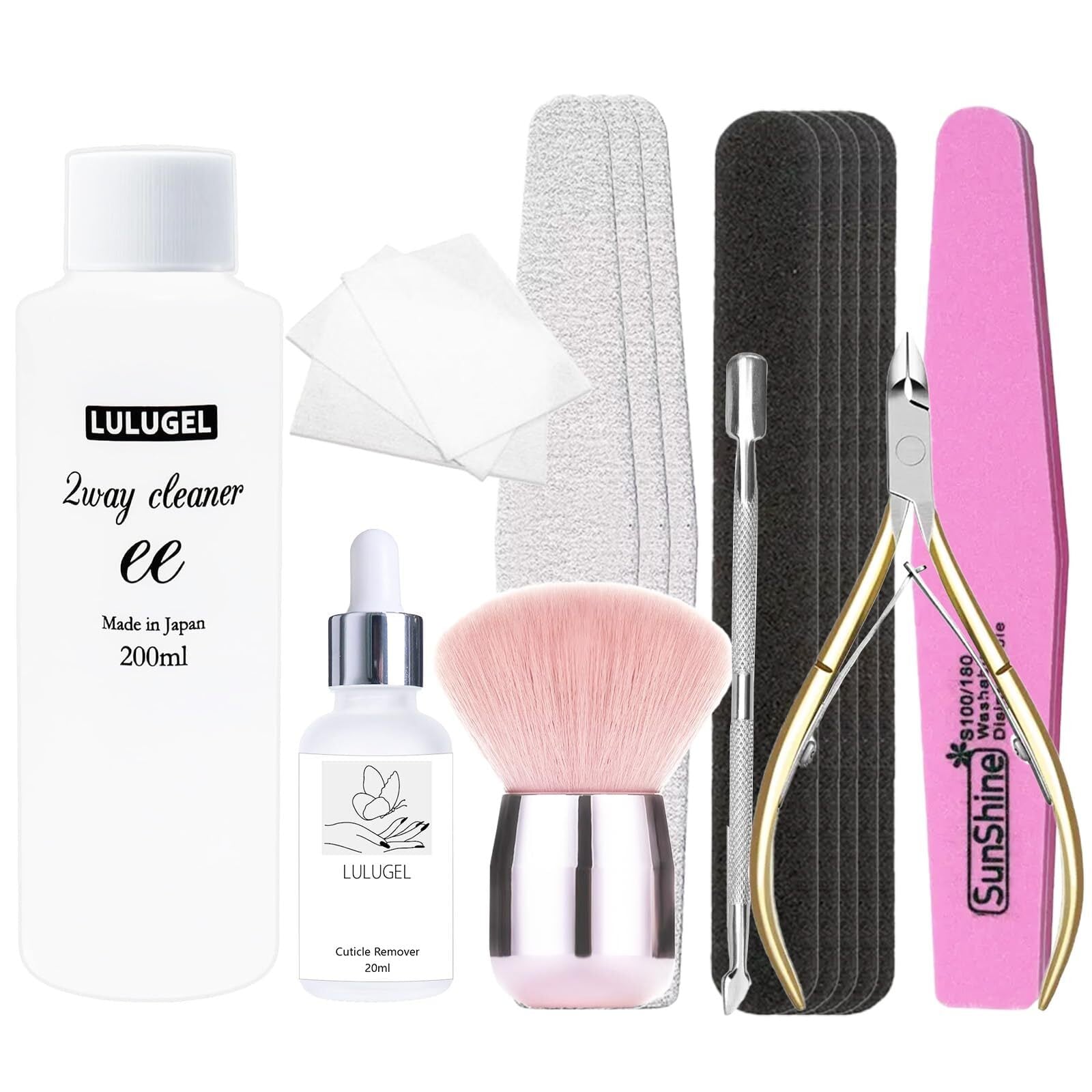 【LULUGELプレパネイル セット】2wayジェルネイル クリーナー200ml x1、キューティクルリムーバー 20ml x1、エメリーボード x5、ファイル x3、バッファ[ピンク] x1、ネイルプッシャー x1、キューティクルニッパー x1、ネイルワイプ x20枚程度、ダストブラシ x1、合計9点のジェルネイルセットです