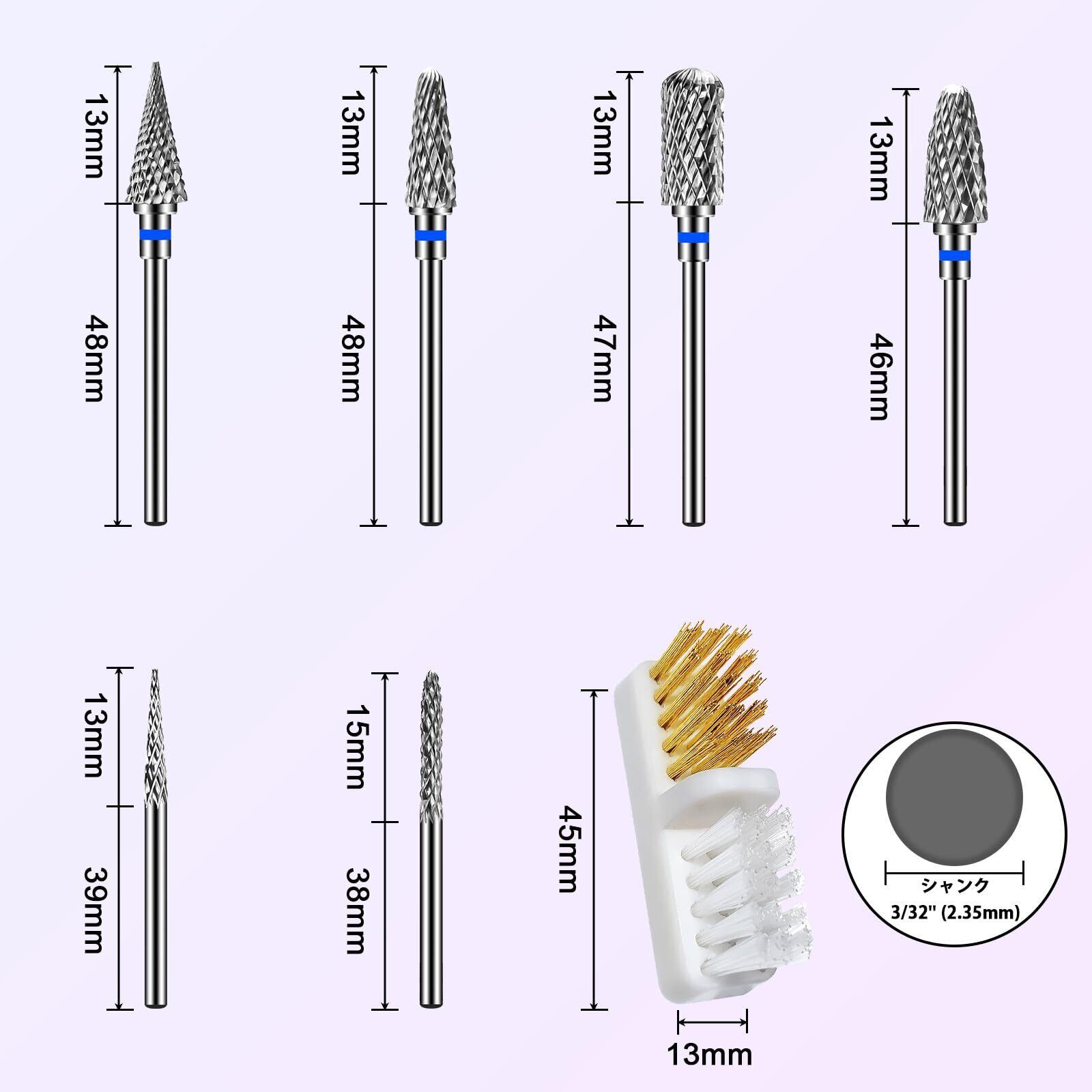 ユニバーサル3/32インチネイルドリルビット】ネイルドリルビットの直径は2.35mm。3/32(2.35mm)インチを使用するほとんどの電動または充電式のネイルドリルマシンに適しています。ご購入前に、ご使用の電動ネイルマシンの直径が適合することをご確認ください。