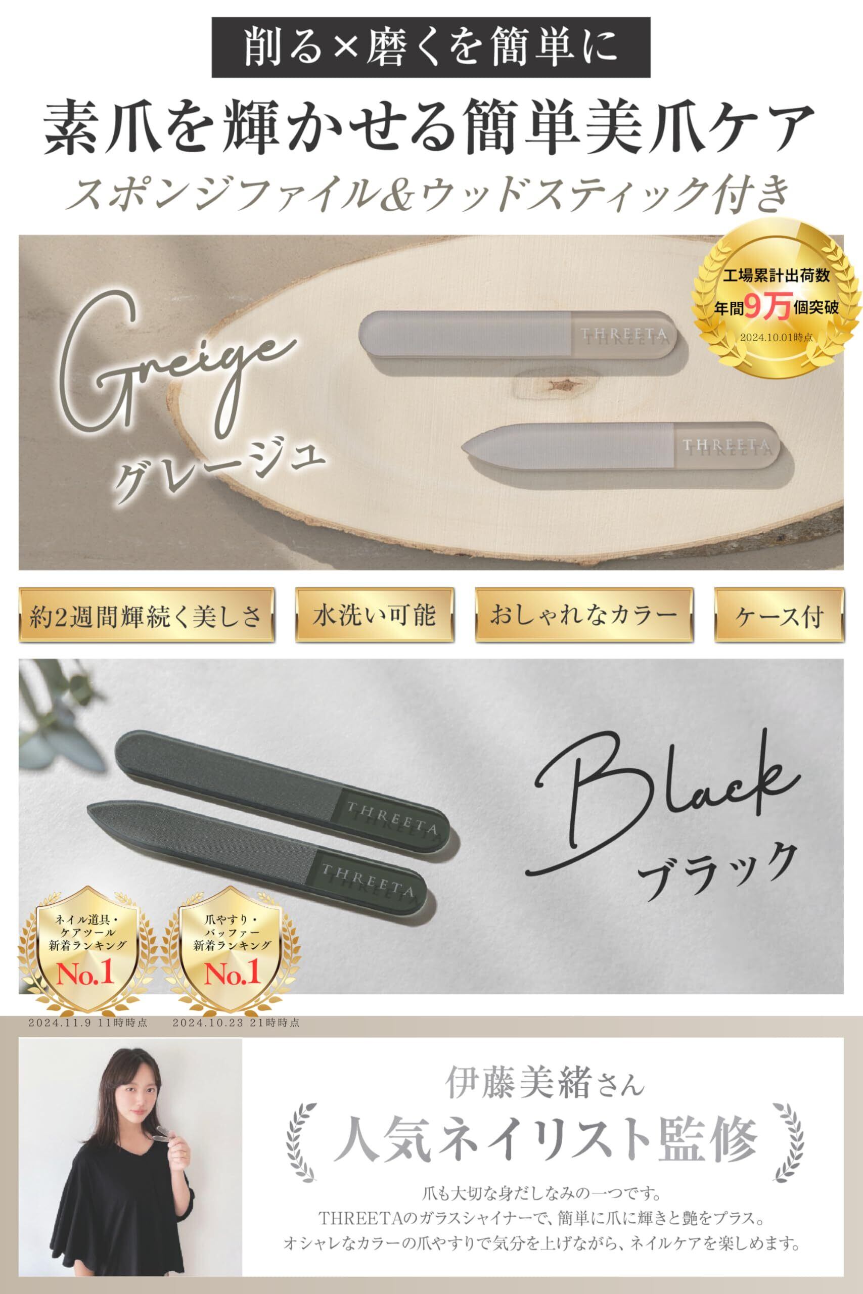 【数量限定】【雑誌掲載商品】 THREETA 爪やすり 【人気ネイリスト監修 スポンジファイル&スティックセット】 爪磨き ガラス製 艶出し ネイル ケア 爪ヤスリ ファイル 子供 男女兼用 (グレージュ2本セット)