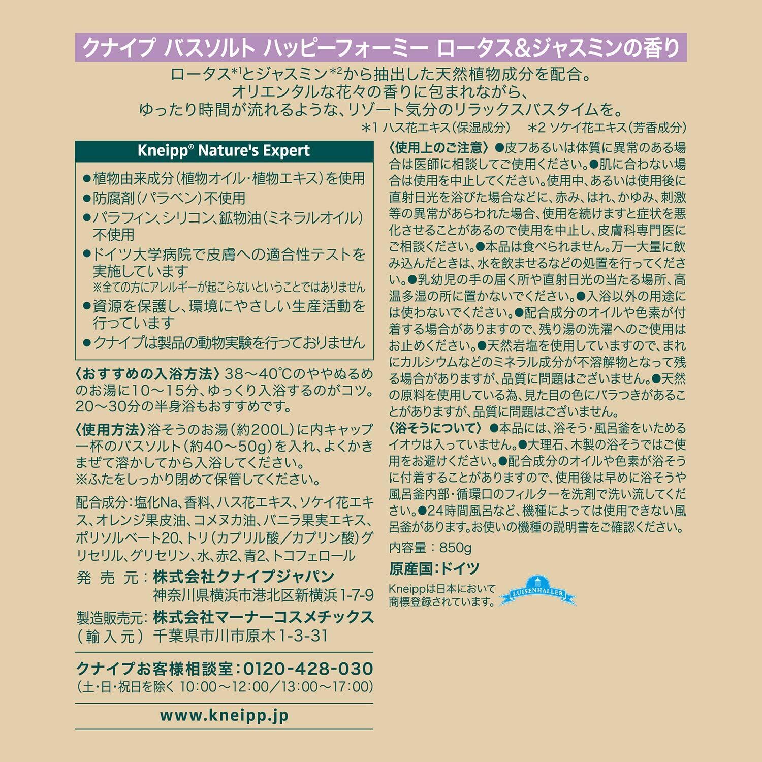 【心地よい香りで特別なバスタイムを!】「クナイプ バスソルト ハッピーフォーミー」は、850gの大容量で、香り高いロータスとジャスミンの香りが、入浴中に心地よいリラックスを提供します。日々の疲れを癒し、贅沢なバスタイムを演出するための必需品です。