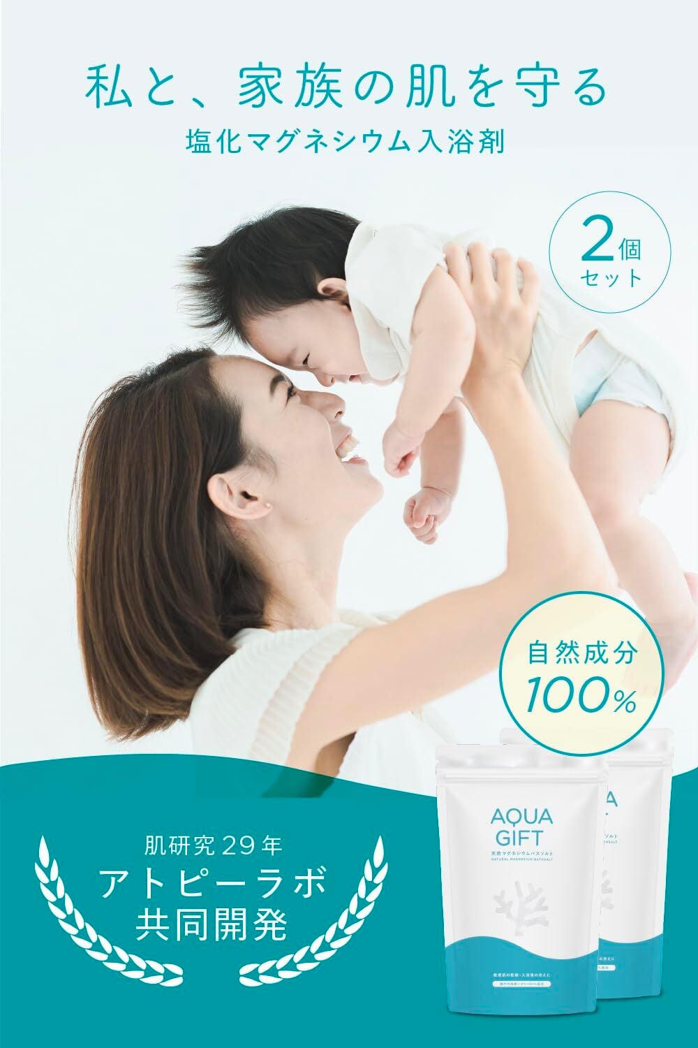 【心地よいバスタイムを実現!】「AQUA GIFT」は、国産のマグネシウムを豊富に含んだ保湿バスソルトです。お湯に溶かすことで優れた浸透力を発揮し、肌の保湿を強力にサポート!日々の疲れを癒し、美肌へと導く極上のバスタイムをお楽しみいただけます。