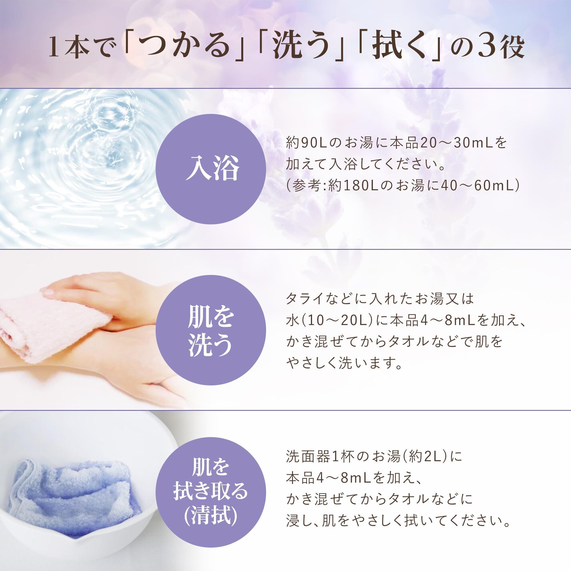 【1500mLの大容量でお得な使用!】1500mLの大容量は、毎日の入浴にぴったり。ご家族全員でシェアできるので、バスルームが楽しいスペースに変わります。ラベンダーの香りが心を癒し、心地よいバスタイムを演出します。