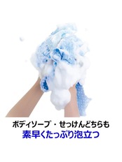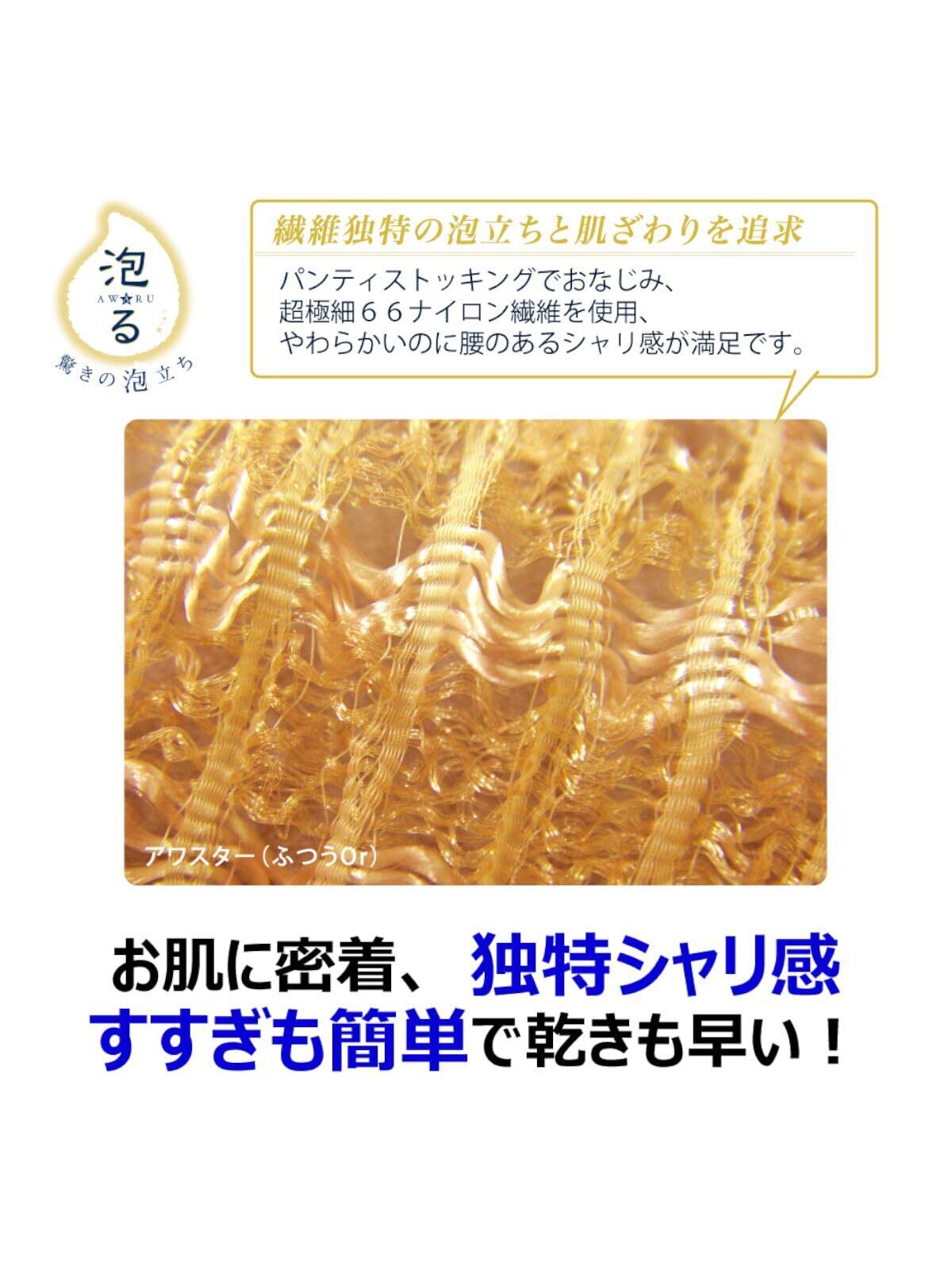 ●3次元ウェーブ立体織りキクロンの独自製法による立体織りで縦糸・横糸に作り出された3次元空間に、空気をたくさん溜めることで、圧倒的な泡立ちを実現しました。 ●超極細繊維66ナイロンアワスターの繊維には細さと強度が特長の、超極細繊維66ナイロンをたっぷり使用。独自の織りによるクリンプ加工が、コシとやわらかさを更にアップ、細くしなやかな繊維がお肌になじみ、きめ細かい泡立ちを生み出します。