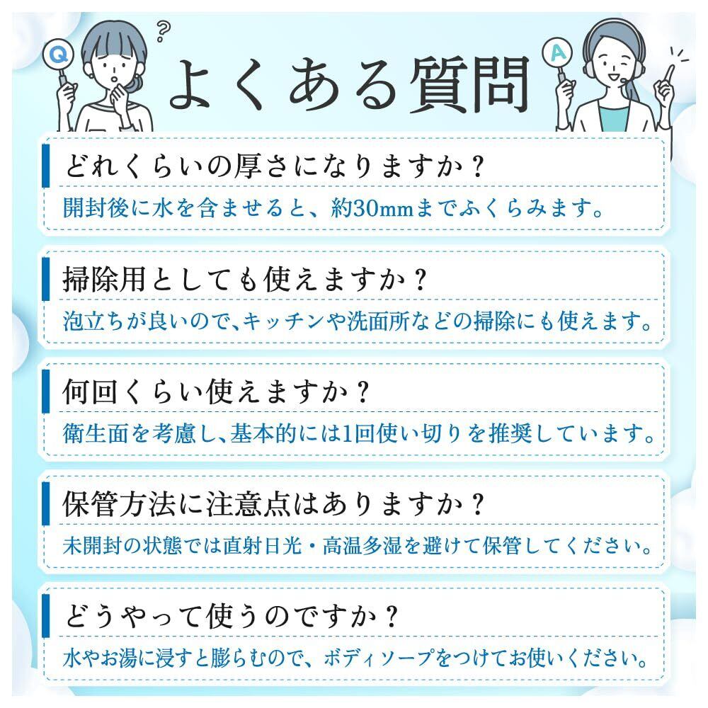 【高品質な洗浄体験をお届け!】「toysfan 圧縮ボディスポンジ」は、業務用としてもご使用いただける、本格的な洗体スポンジです。使い捨てタイプで、衛生的な入浴体験が可能です。厚さ約30mmのボディスポンジは、しっかりとしたクッション性を持ち、全身を優しく洗い上げます。