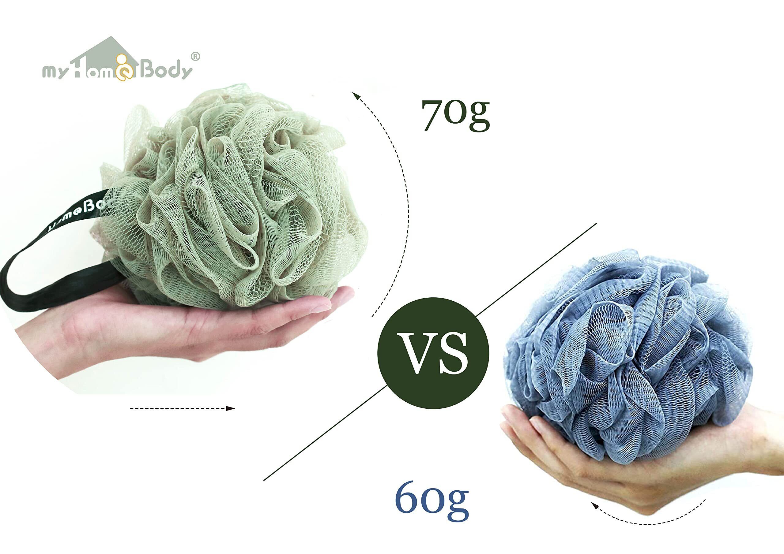 myHomeBody 大きめサイズ 70g 泡立てネット、ボディタオル, ボディスポンジ、ボディスクラバー、バススポンジ 女性 男性用、アカスリスポンジ、ボディウォッシュボール、ボディタオル、活性炭入り – 2 グラファイトグレー + 1 セージグリーン、3 パック