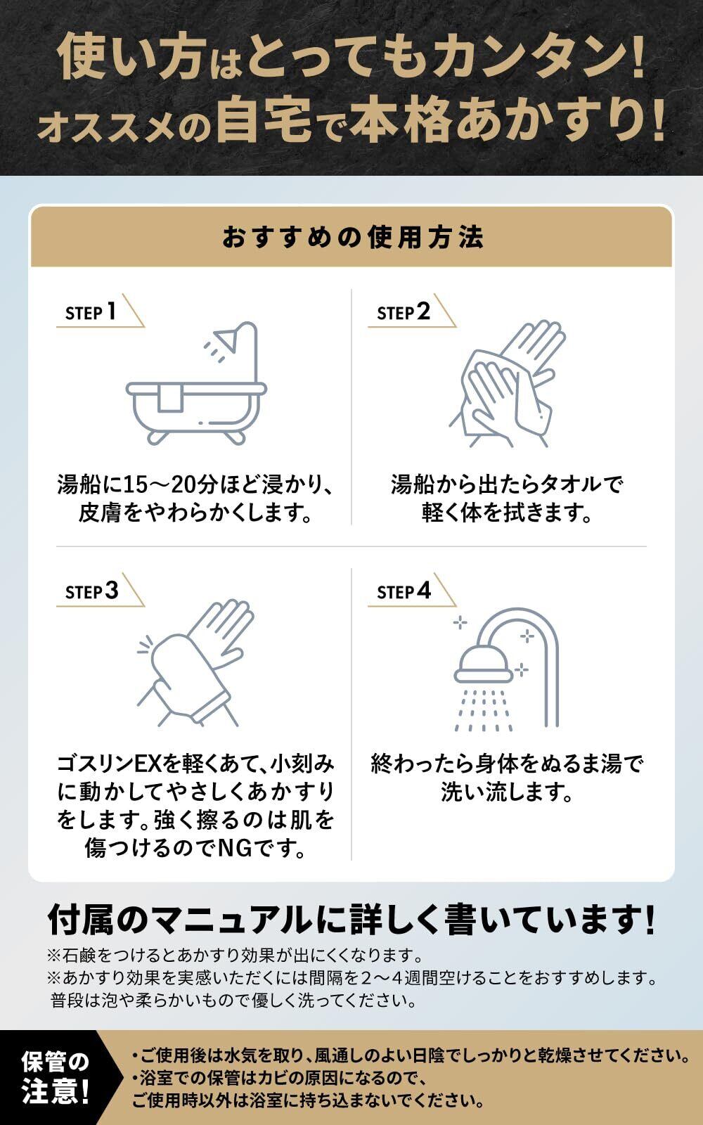 【やさしさと効果を両立したあかすりミトン!】「あかすりミトン ゴスリンEX リニューアル版」は、心地よい3D立体構造を採用し、肌に優しくフィット。やさしい感触で、こするとポロポロと角質が落ちる爽快感が楽しめます。特に韓国式あかすりを体験したい方にぴったりのアイテムです!