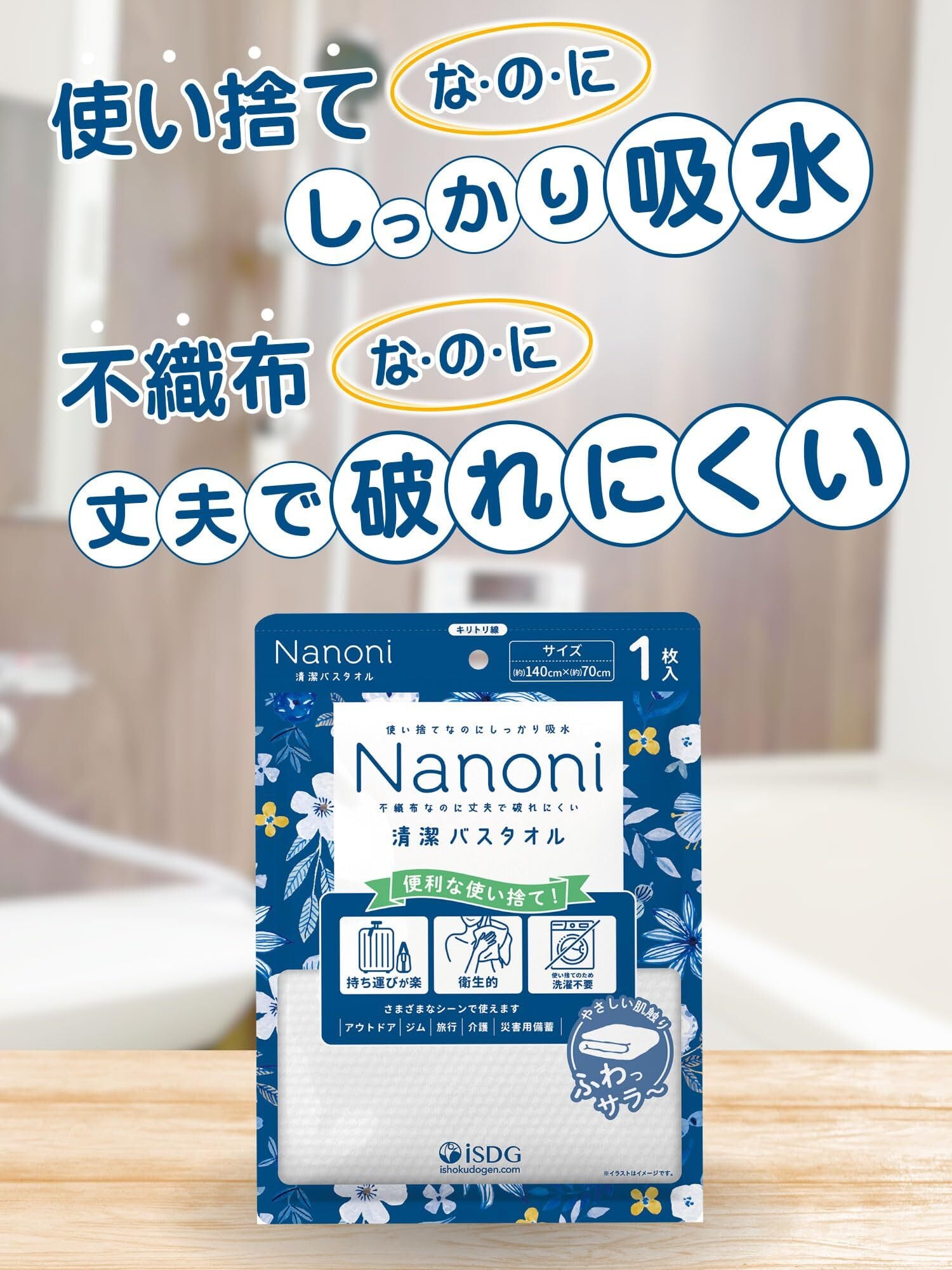 【高品質&清潔感が嬉しい使い捨てバスタオル!】この「Nanoni 清潔バスタオル」は、約140cm×70cmの大判サイズで、しっかりと体を包み込むサイズ感が特徴です。使い捨てで衛生的なため、旅行やスポーツ、ジムなど様々なシーンで活躍します。