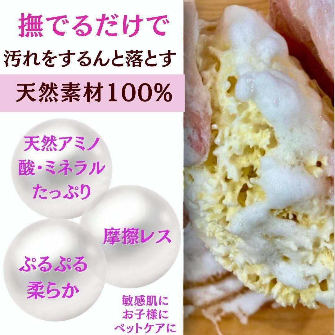 【使用方法】海綿を濡らして柔らかくします。ボディソープ等をたっぷり含ませてやさしくお使いください。こすらず、優しくなでるだけ、毛穴汚れ、古い角質がしっかり落ち、お肌への負担がありません。使用後は、スポンジをすすぎ、軽く絞って水を切り、乾燥させてください。海綿は海の粒子が残っている場合があるため、初めて使用する前には必ずスポンジをよく洗ってください。