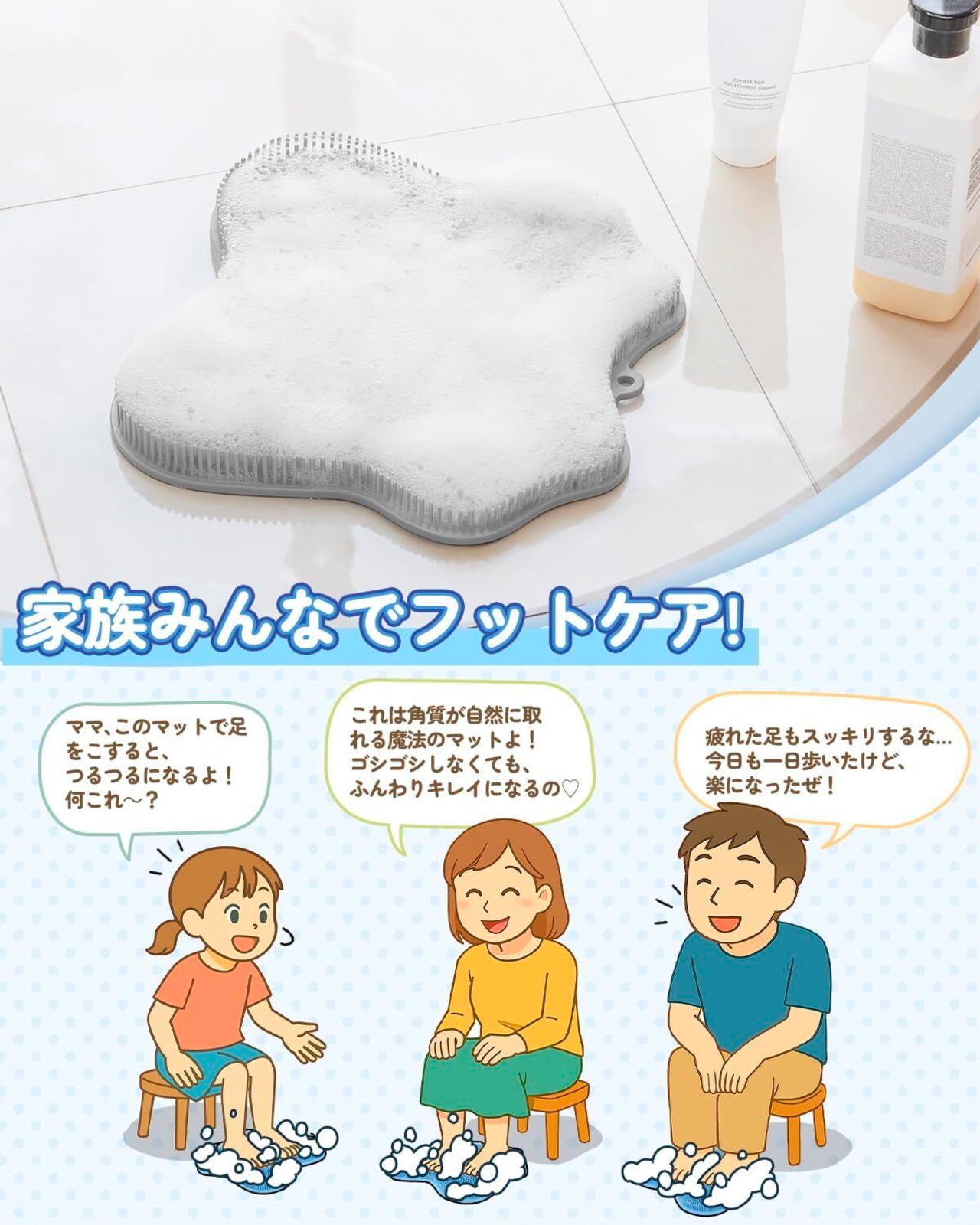 【ご家族みんなが使える!】ファミリー向けのデザインと機能性を兼ね備えているため、お子様の足洗いや敏感肌の方にも優しくお使いいただけます。毎日の足のお手入れが楽になることで、全員が清潔感を持つことができます。