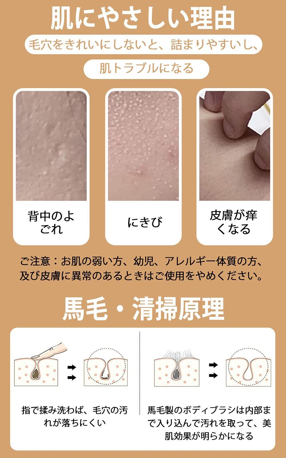 ✨「両方用のボディブラシ」:柔らかすぎず硬すぎず馬毛なので、風呂用またはドライブブラッシング用としてお使えていただきます。お風呂の最中に、背中をゴシゴシ洗いたい人や毛穴汚れをキレイにしたい方にオススメです。●肌もブラシも干した状態で全身をブラッシングして、お肌に優しくて、女性に対しては大人気です。