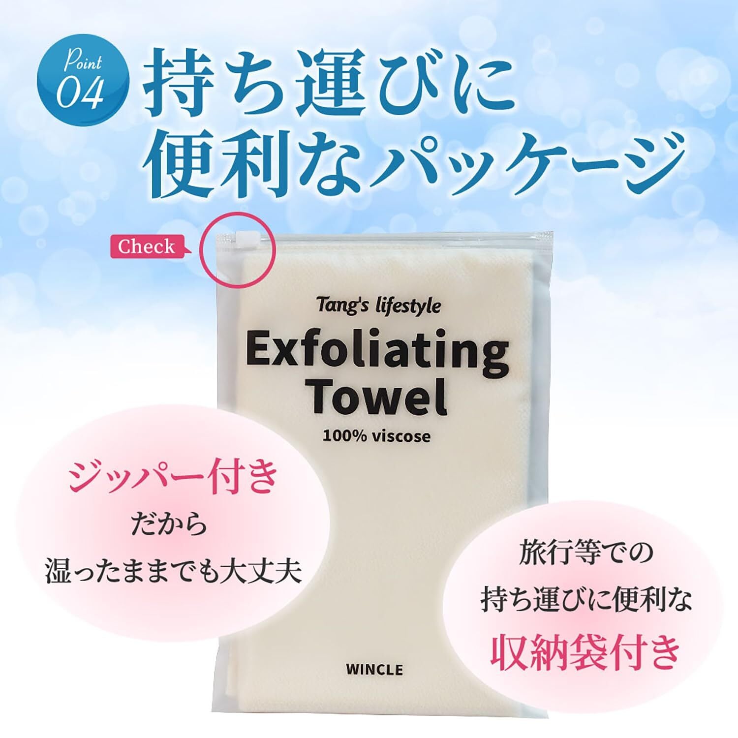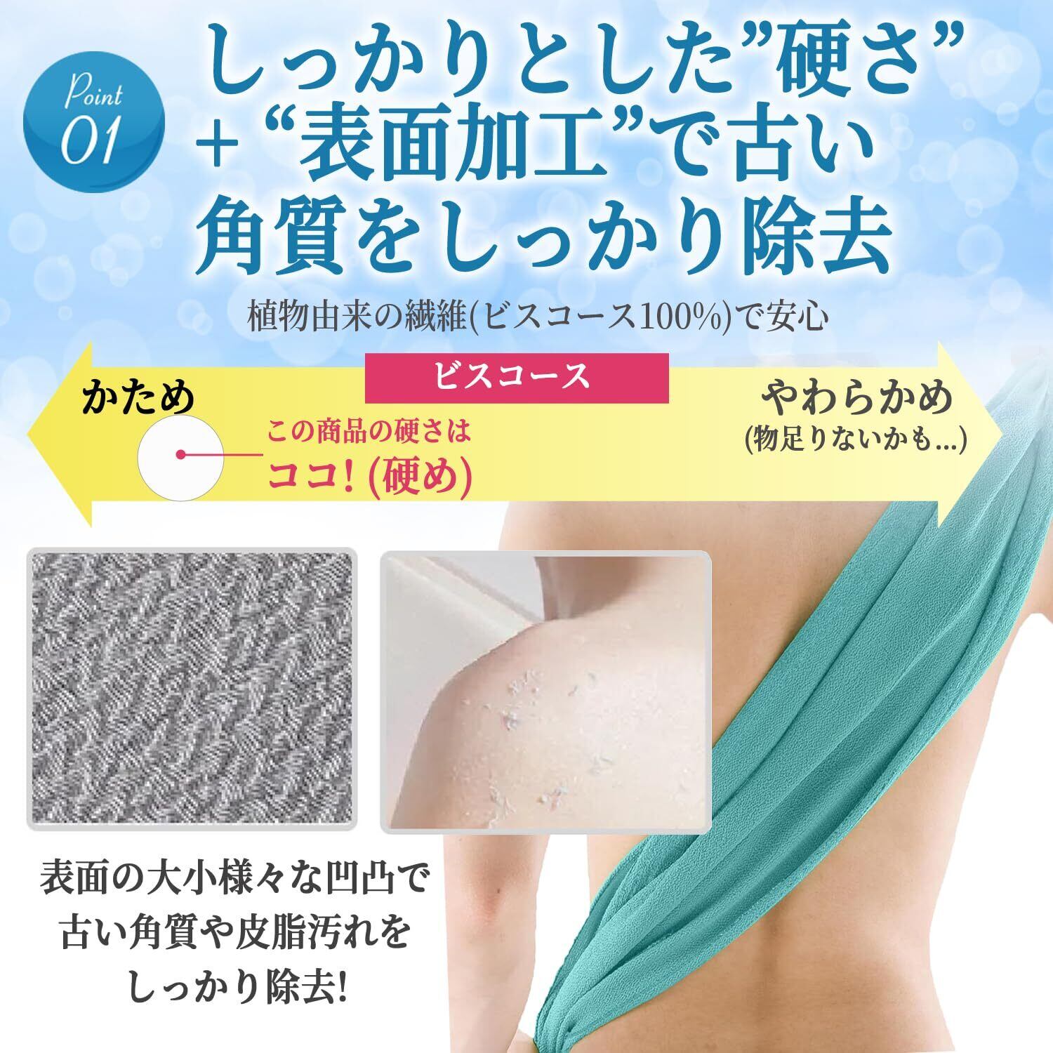 【肌に優しいビスコース生地!】このタオルは、植物由来のビスコース生地を使用しており、角質をしっかり除去しながらも肌に優しい、心地よい肌触りを実現しています。毎日のボディケアが楽しくなり、透明感のある美しい肌へと導きます。