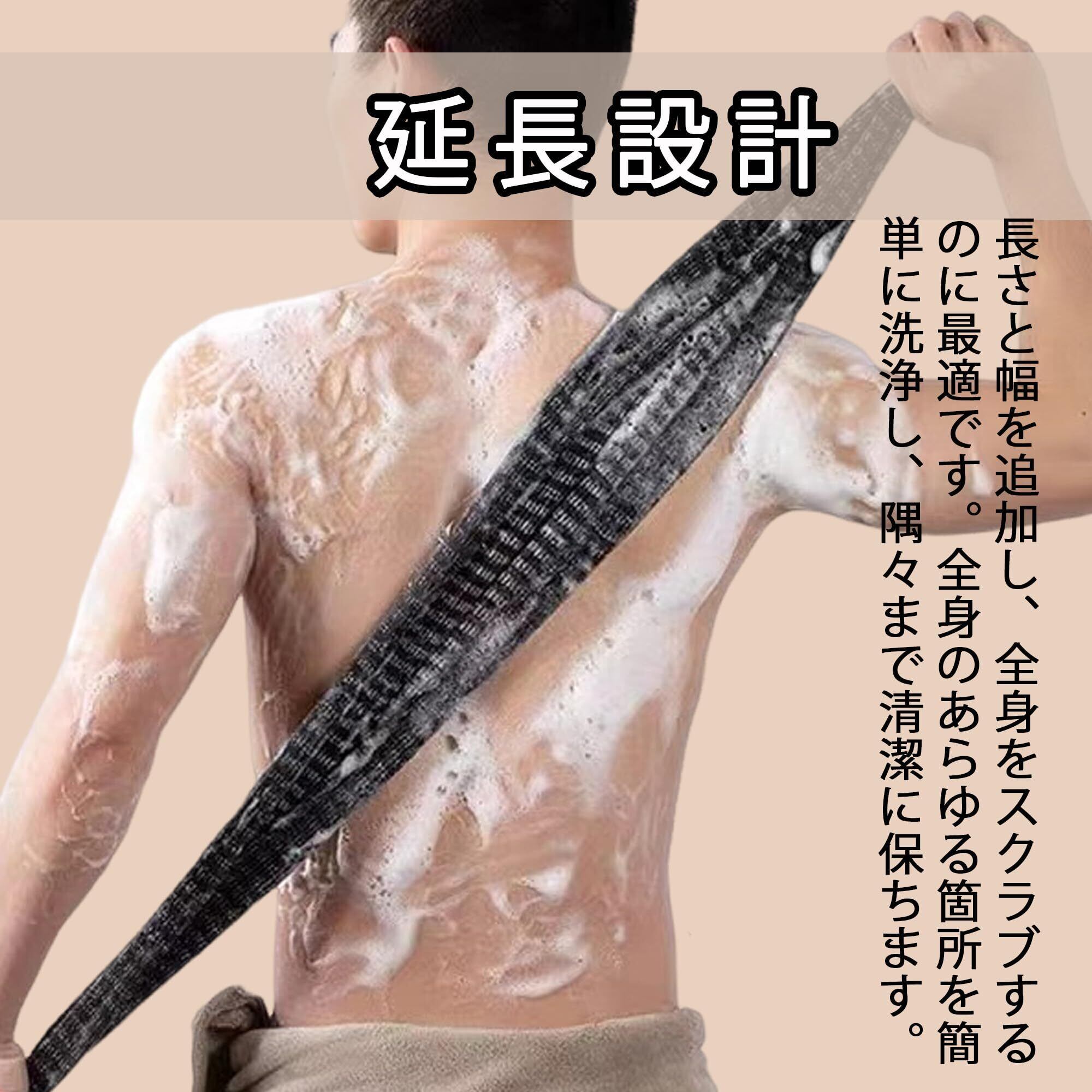【ユーザーフレンドリーなサイズ設計】タオル のサイズは107×25cm、重量は約50gと極軽で、使用の便利さとカバー範囲の広さを兼ね備えています。超長い設計は、背中など自己清掃時に届きにくい部位も簡単に触れて掃除することを保証し、バスタイムを全方位の楽しみに変えます。